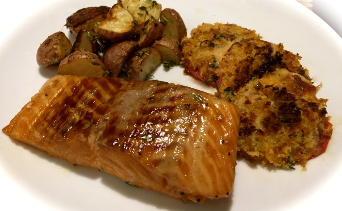 Serving Suggestion: Grilled Salmon with Panko Crusted Tomatoes and Roasted Baby Red Potatoes…