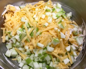 Shred the cheddar cheese and set aside. Remove the core from the apple and dice into small pieces, leaving the peal on. Set aside.