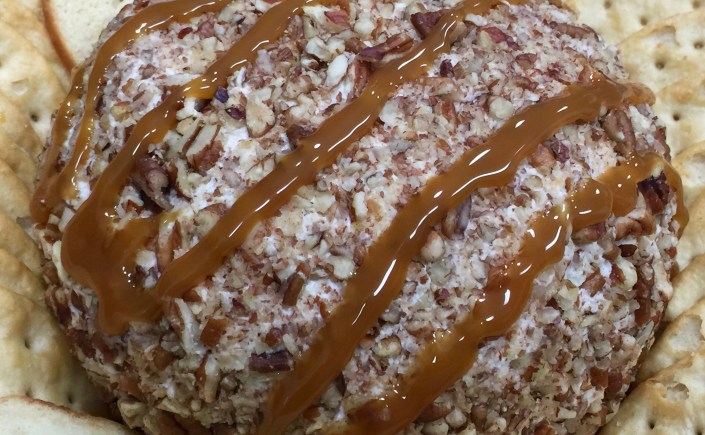 Drizzle the caramel sauce on the cheese ball right before serving.