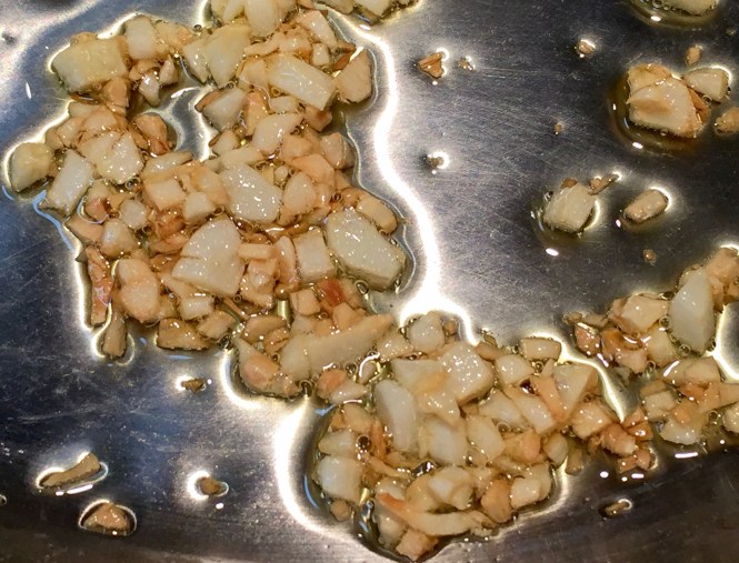 Lesson Learned 2 – Browning the garlic: You use a lot of garlic in this recipe and it’s a key flavor component. But garlic can be tricky and easy to burn. Saute your chopped garlic in some olive oil until it has a light golden brown color (see the picture below). Stir the garlic regularly while it is sautéing to prevent any burning. Remove it from the heat and immediately put it in a bowl so  carry over cooking is minimal. Make sure to include the oil from the pan with the garlic as you need to add that to the tomato mixture as well.