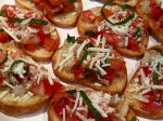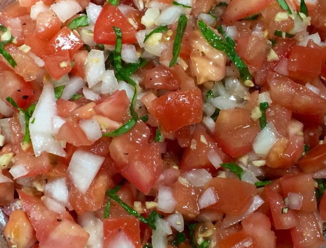 I used small campari tomatoes. You can also use vine ripe tomatoes that are more firm. Stay away from over-ripe soft tomatoes. You will wind up with a mixture of mush if you use them. Once you put together the tomato mixture let it chill in the refrigerator for at least a half hour. That way the ingredients get better acquainted and some of the water drains out of the tomatoes. I drained the water from the mixture when I took it out of the refrigerator and used a slotted spoon when I was putting the tomato mixture on the bread to eliminate as much moisture as I could. Doing this also prevents the baguette from getting soggy.