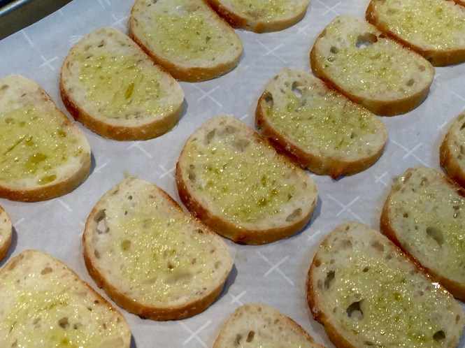 In a small bowl season 2 Tbs. of olive oil with salt and pepper. Lay baguette slices on a parchment paper lined baking sheet. Using a silicone basting brush baste the slices with the olive oil mixture. Bake for 8-10 minutes or until the edges are slightly browned.