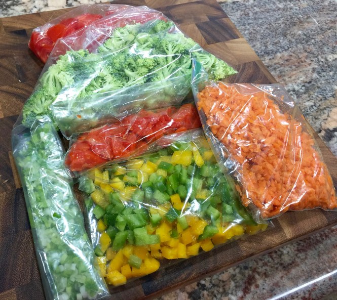 Lesson Learned 1 – Chop the veggies ahead of time: I found that to be a lifesaver. I chopped the veggies and put them in refrigerator bags. Then when it came time to assemble the pizza I just opened the bags and sprinkled them on the crust. It was a snap.