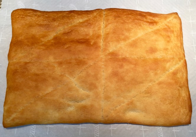 Lesson Learned 3 – To the best of your ability, pinch together the perforations in the crescent roll dough: This recipe uses refrigerated crescent roll dough as the crust. Do not separate the dough into pieces. Roll the dough out and pinch together the perforations to form as flat of a continuous base as possible. You can still see the faint outline of the individual pieces, as seen in the picture below, but that won’t matter once you apply the toppings.