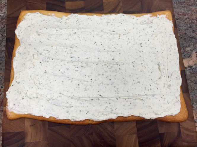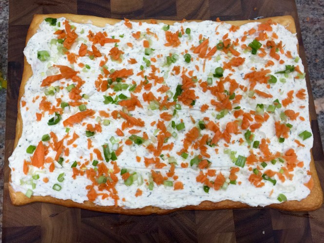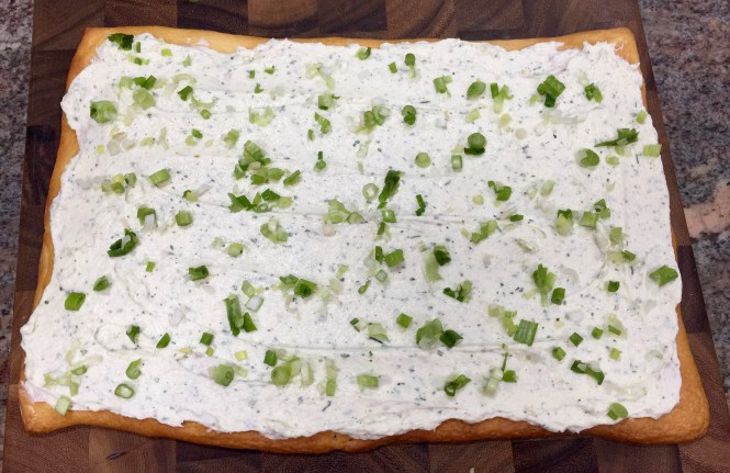 The rest is easy. Just mix the cream cheese “sauce” and apply it to the dough, sprinkle on the toppings, cut and serve. I know you’ll enjoy this one!