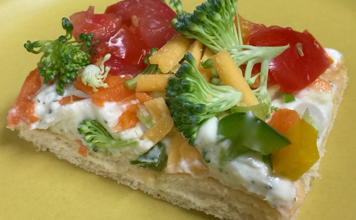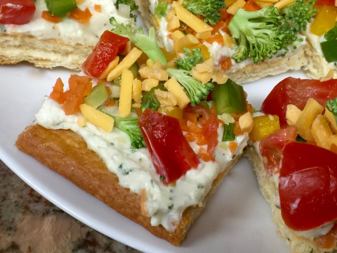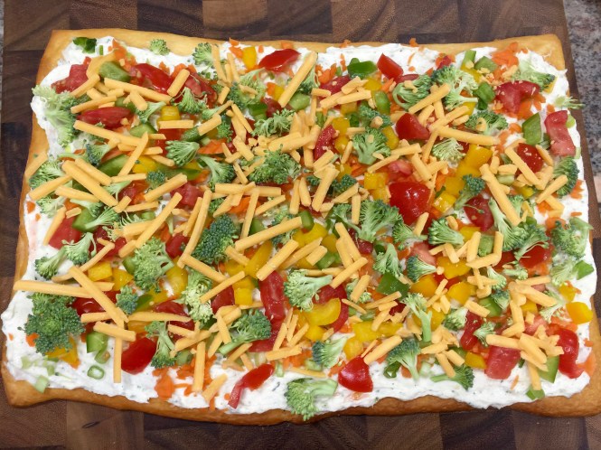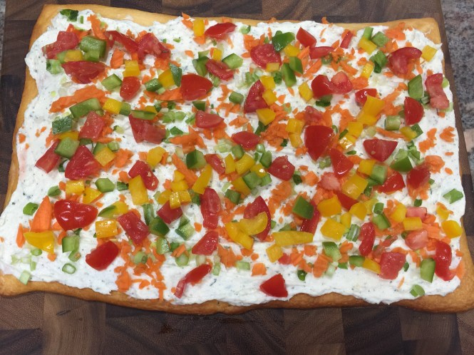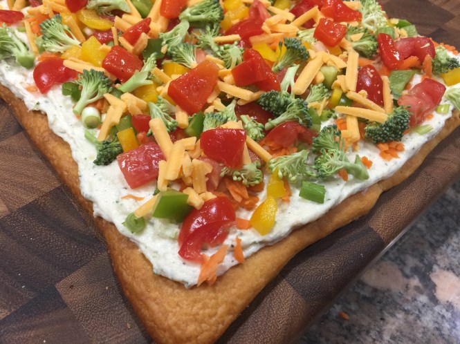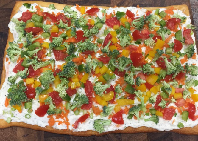 This appetizer is not only tasty but so colorful it brightens up any table. And a lot of it can be prepared ahead of time, which I did. That way the assembly doesn’t seem quite so overwhelming. So let’s talk vegetable pizza.