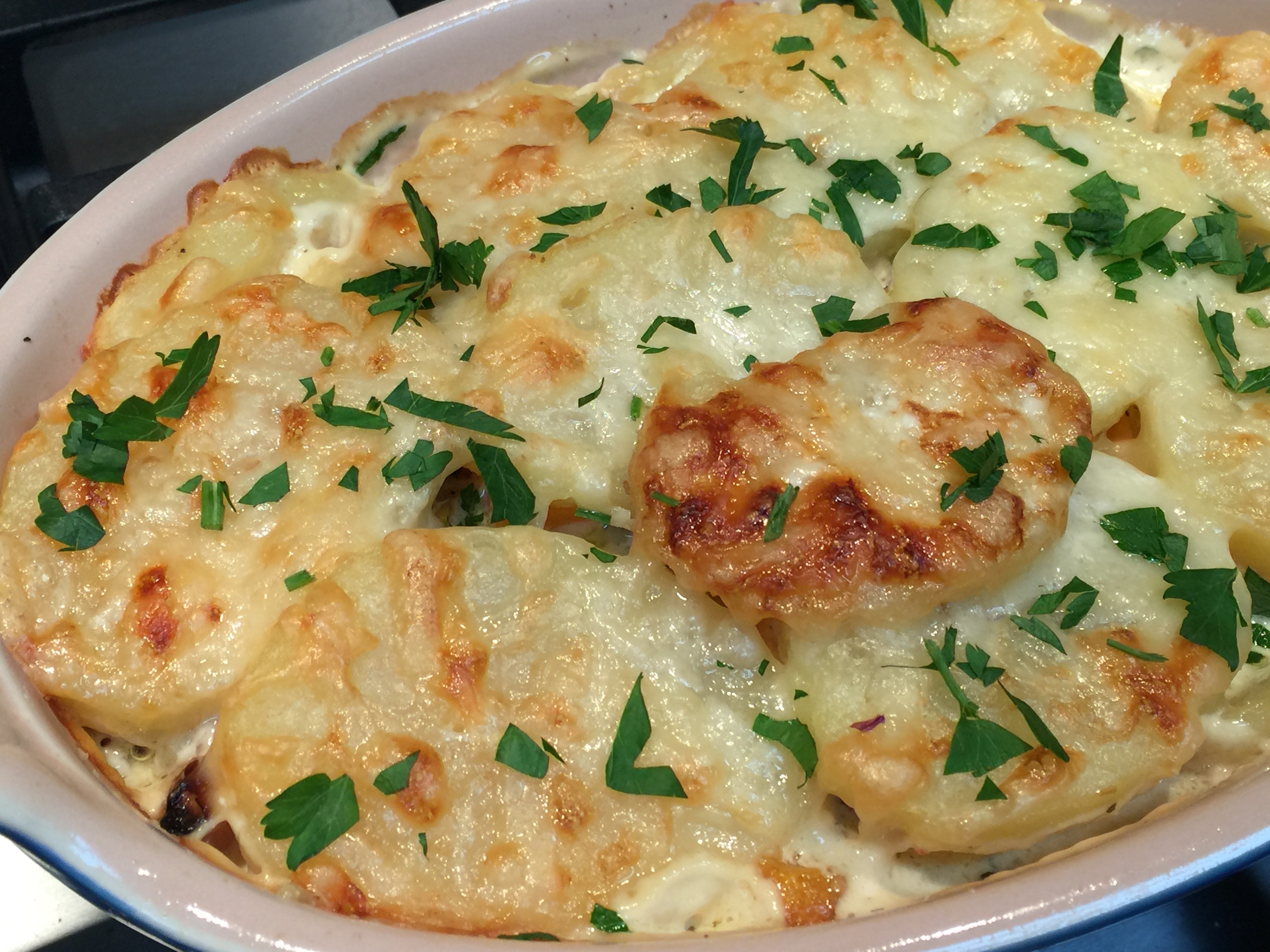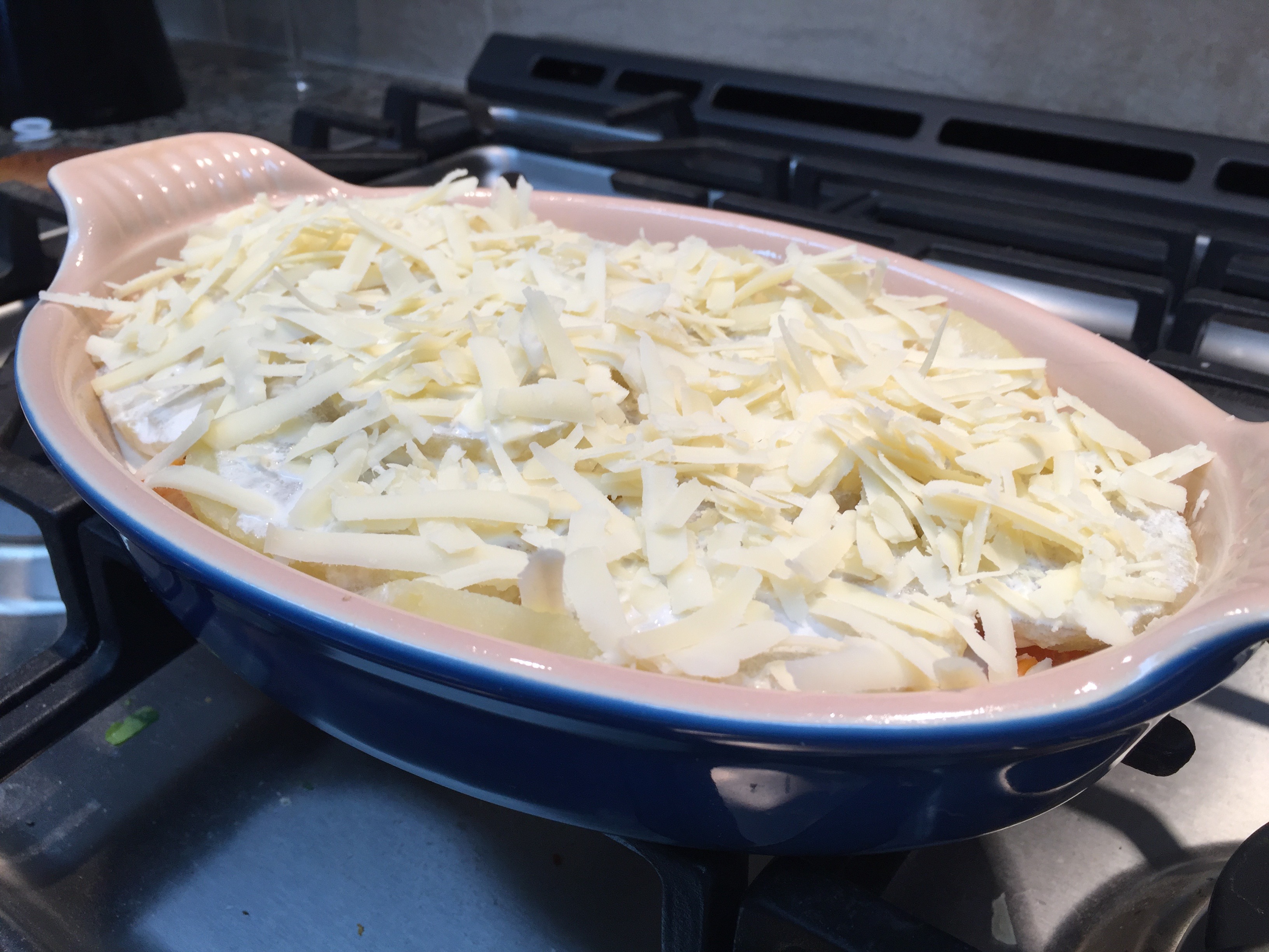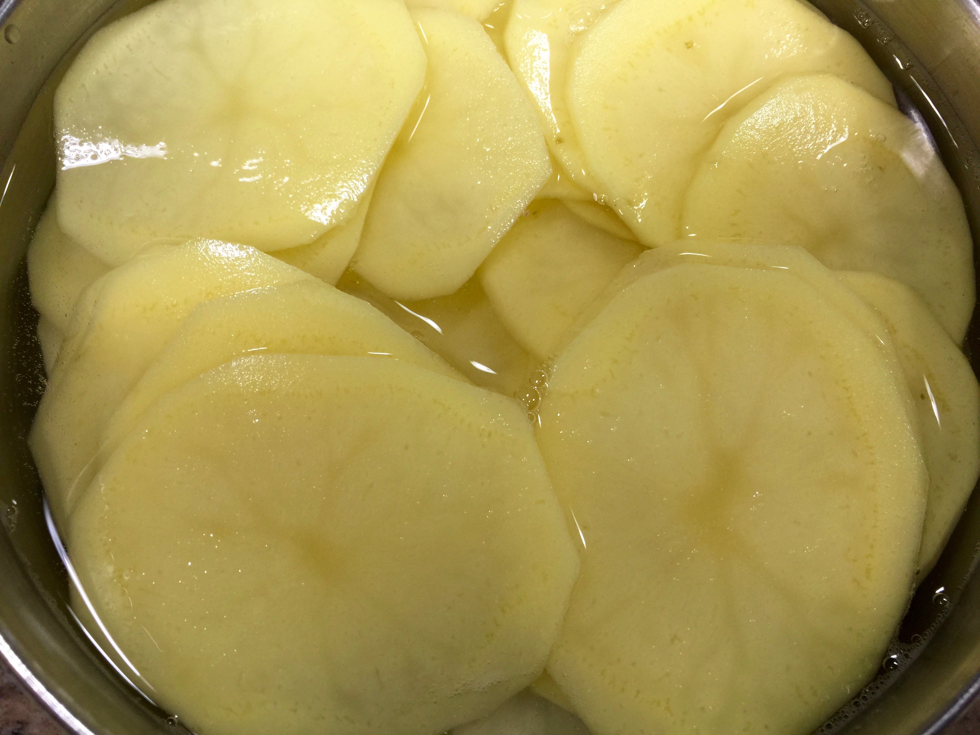 Lesson Learned 3 – Those tricky potatoes: I don’t know about you but, for me, potatoes are tricky when using them in a casserole, specifically sliced potatoes. I’ve experienced many instances where they were hard and not cooked through. This time they turned out perfectly. This is what I did. I used two medium sized yukon gold potatoes and boiled them with their skins on until I could easily stick a fork in them. Then I put them in a colander and let them cool. It is important to let them cool. If you try to cut them when they’re hot they’ll fall apart. Once they cool you can easily peel and slice them. Can you leave the peel on? Of course you can. My husband prefers them with the peel off. I sliced potatoes into half inch thick rounds and they were delicious. One of the first things my husband said when he took is first bite was, “the potatoes are good”. Success!!