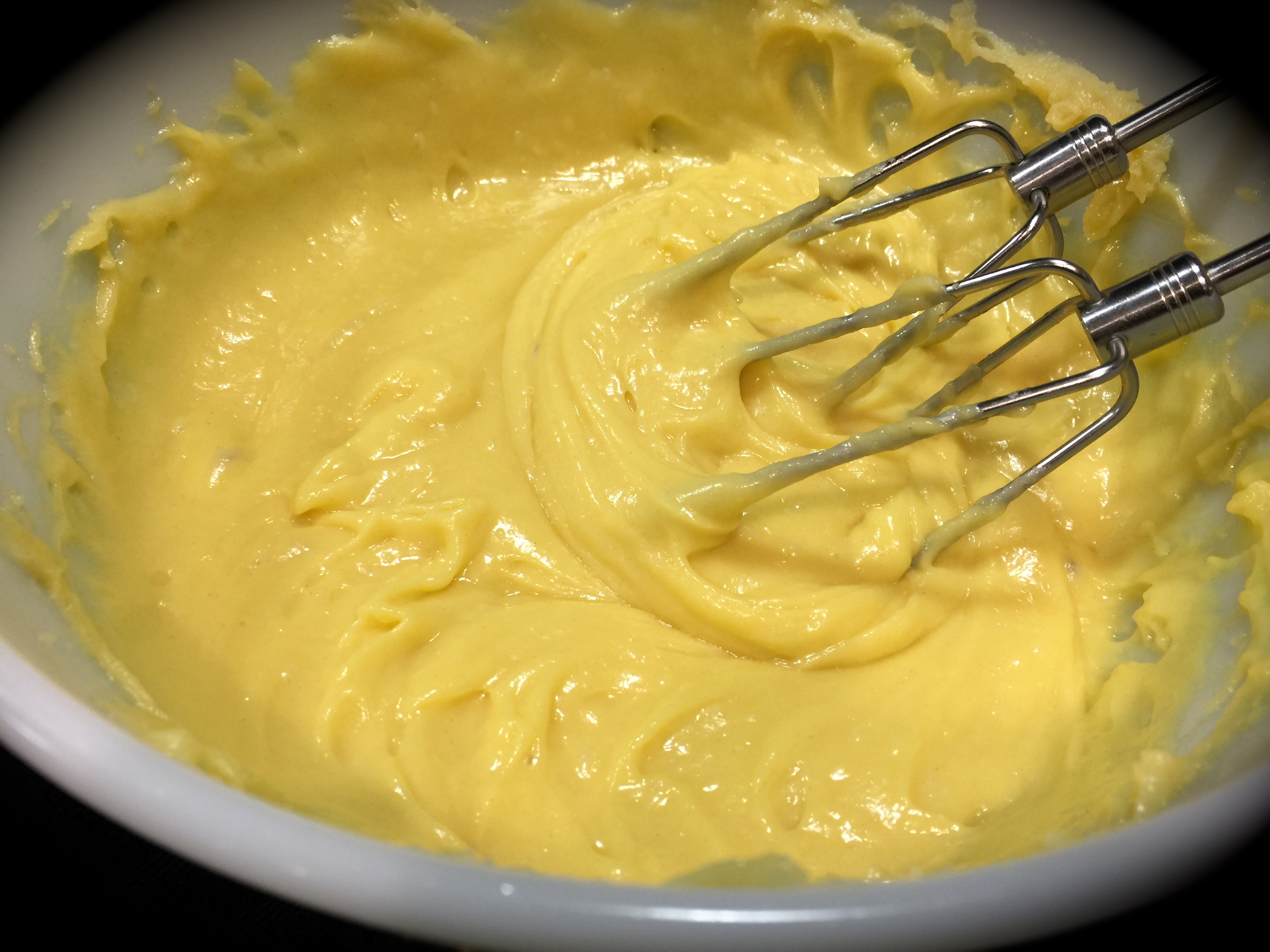 In a large mixing bowl, mix together all of the cake batter ingredients except the melted butter. After everything is combined, slowly add the melted butter in small amounts making sure it is thoroughly combined before adding more. Continue with this process until all of the melted butter is incorporated into the batter.