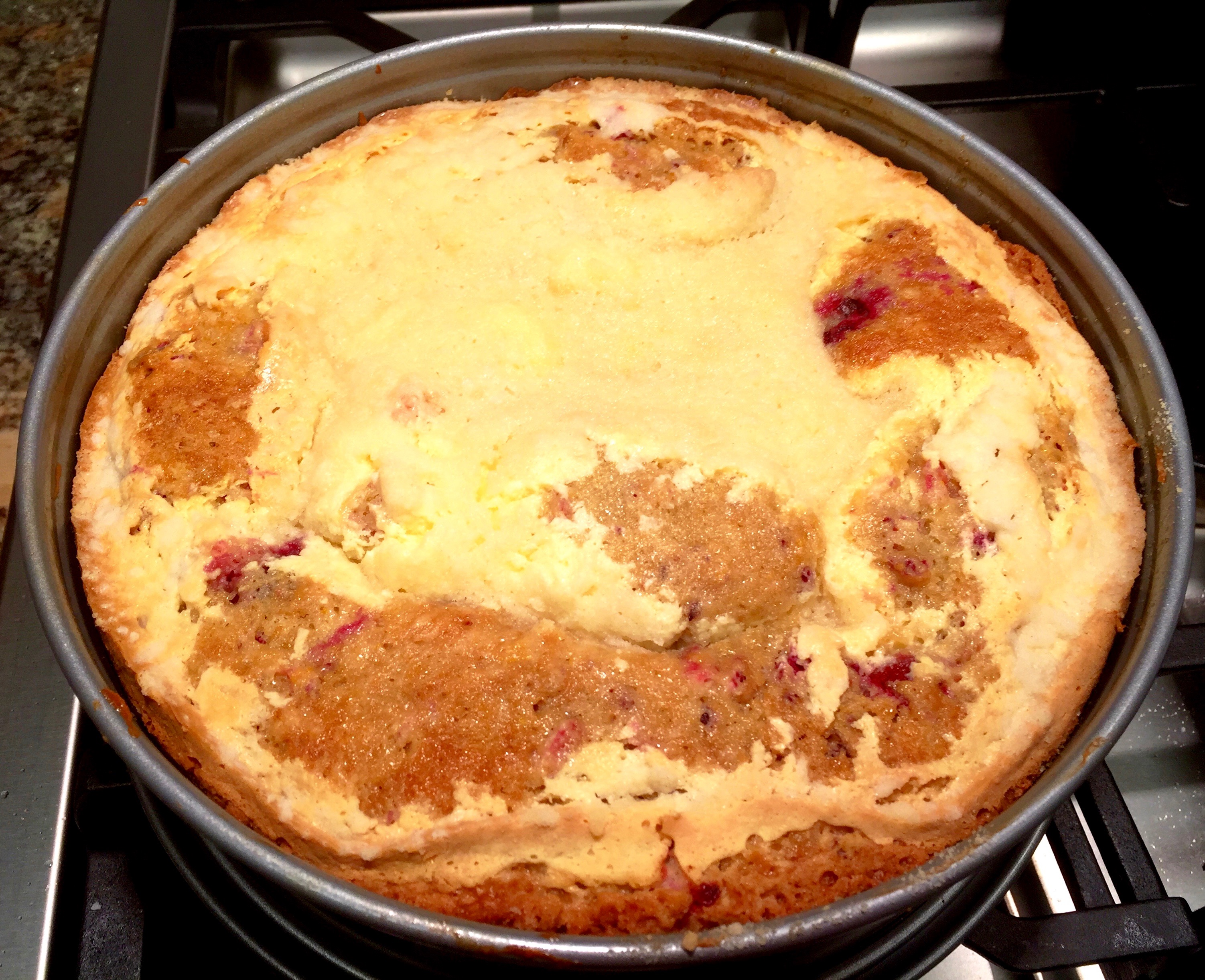 Lesson Learned 4 – Arranging the blueberries in the layers: This cake requires two blueberry layers, one on top of the cake batter layer and one on top of the cream cheese layer. When putting in both layers be careful to not let any of the blueberries touch the sides of your spring form pan. If you do you’ll find it difficult to clean the sides of the pan after baking. If you don’t you can still clean the sides of your pan, it’s just a little more difficult even though the pan has been greased.