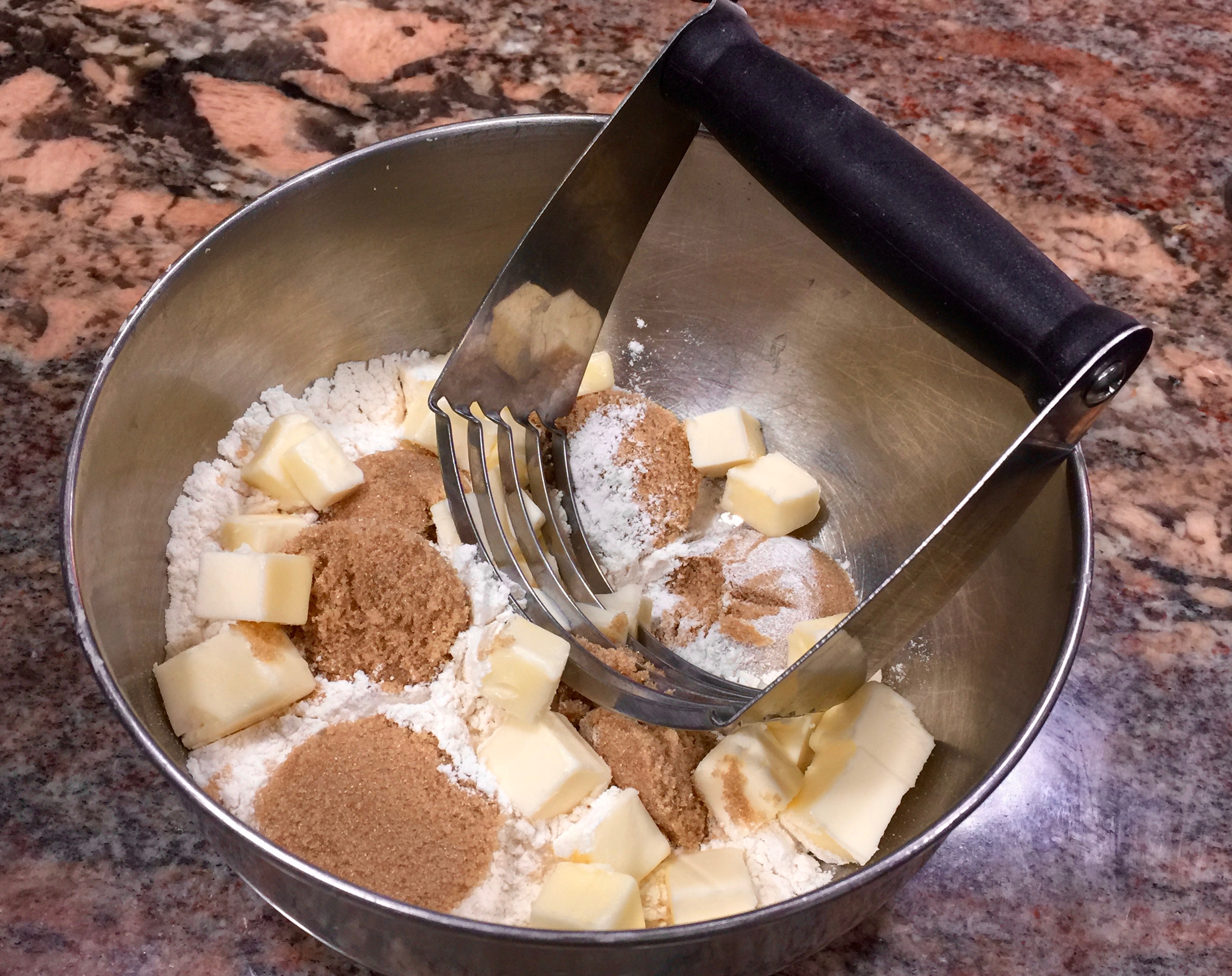 For the streusel topping combine sugar, flour and chilled butter in a bowl. Cut the butter in with a pastry blender until the mixture is crumbly and and the crumbles are pea sized. Set aside.