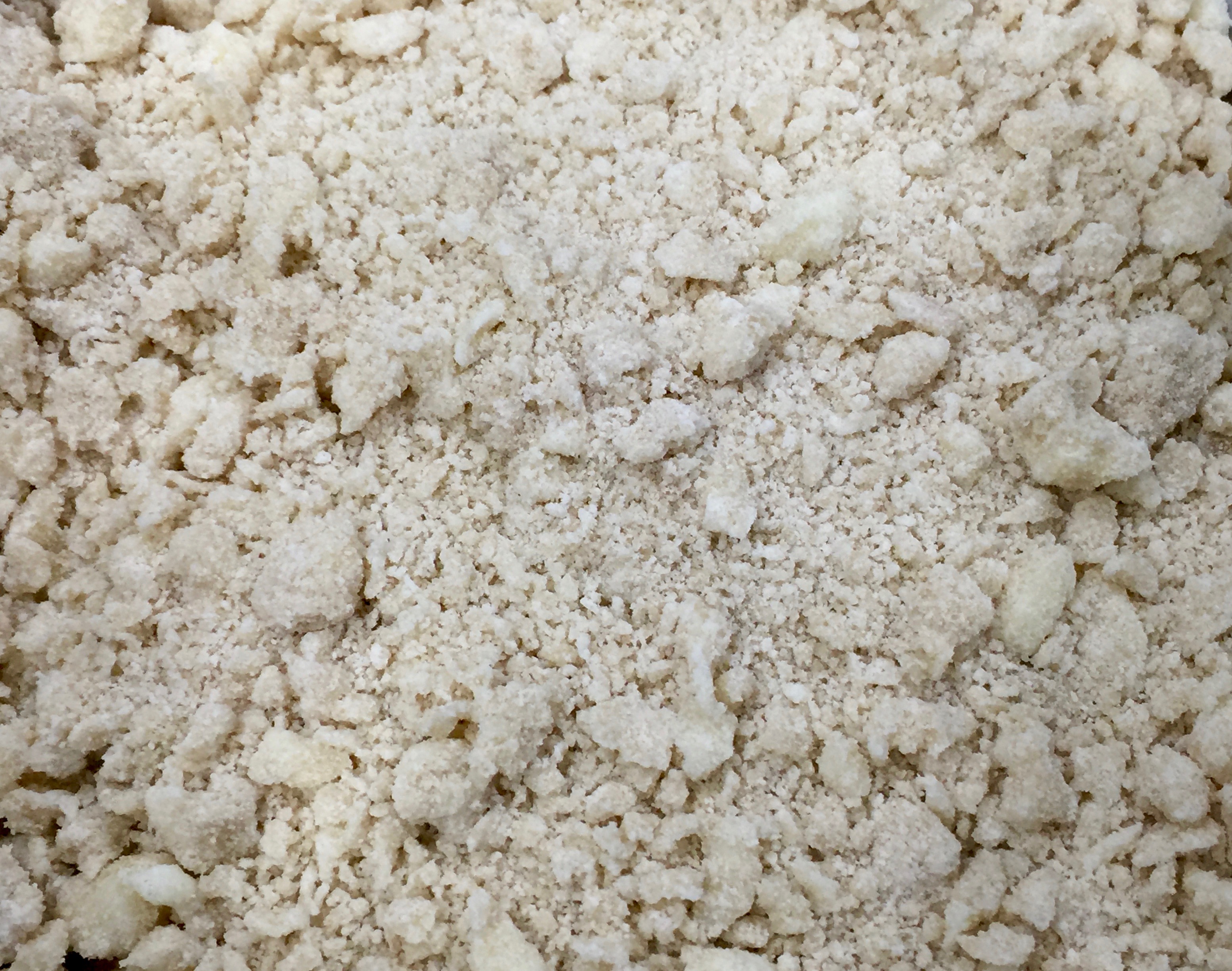 Perfect Crumble ConsistencyLesson Learned 1 – The crumb topping: Only three ingredients make the topping – flour sugar and melted butter. I found the best result for making the topping is to add 1 additional tablespoon of flour to the 1/3 cup called for in the recipe. That way you get a nice crumble without the mixture being too moist. The crumb topping is easy to do. Just melt the butter and combine it with the flour and sugar. If the mixture looks too dry, add a tiny bit more melted butter. Make sure nothing is dry in the crumble. The picture here shows the perfect consistency.