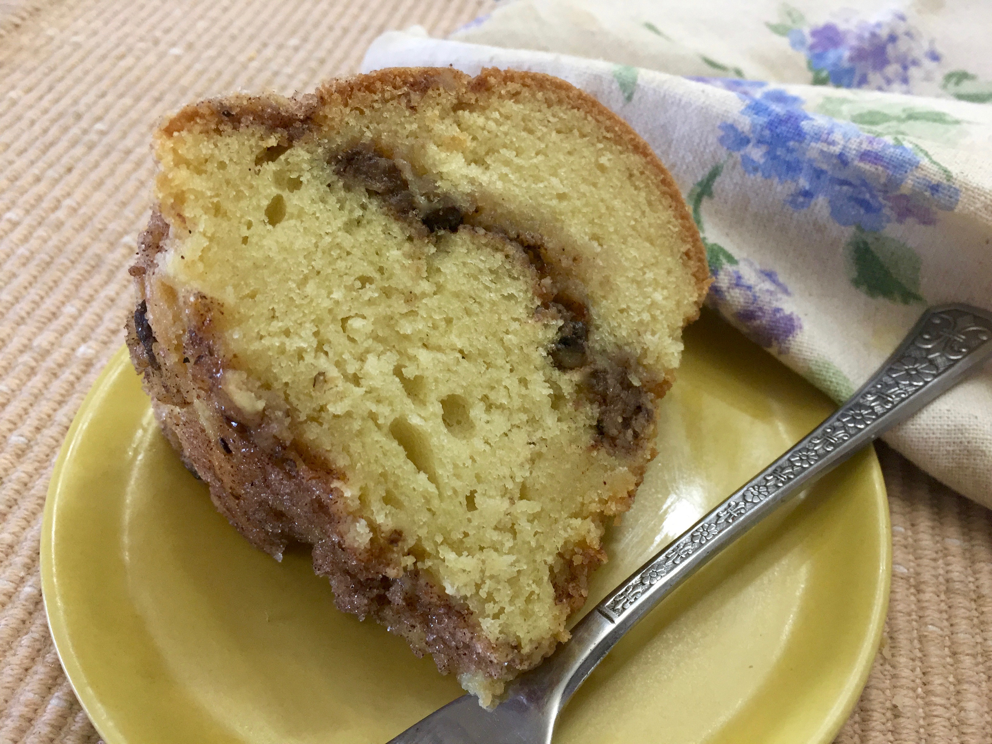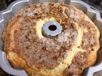 Lesson Learned 3 – How to combine the cinnamon and cake batter: Many recipes similar to this require sprinkling the topping on the batter and using a knife to swirl it down into the cake. You don’t need to do that with this recipe. All you need to do is dollop the cinnamon mixture on top and use a knife and spread it around. The cinnamon will permeate the batter while it bakes. Try to spread the mixture as close to the edges as possible. That way the end pieces will have some cinnamon in them as well.