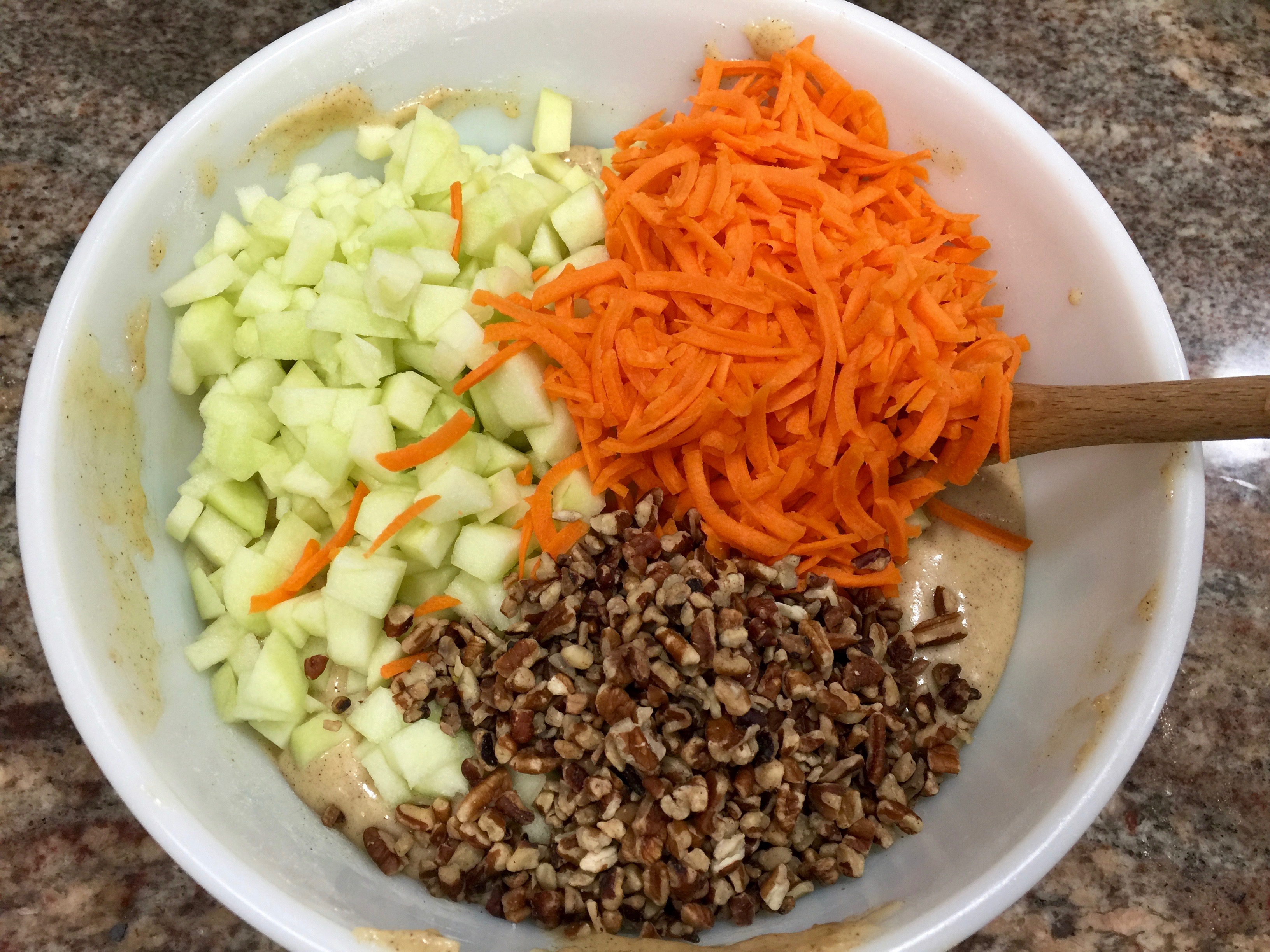 For the batter: In a large bowl sift together the flour, baking soda and baking powder. In another large bowl mix together (using a hand mixer) the remaining ingredients. Pour the dry ingredients into the wet ingredients and gently fold them in using a wooden spoon or spatula. Continue until just combined. Do no over mix.