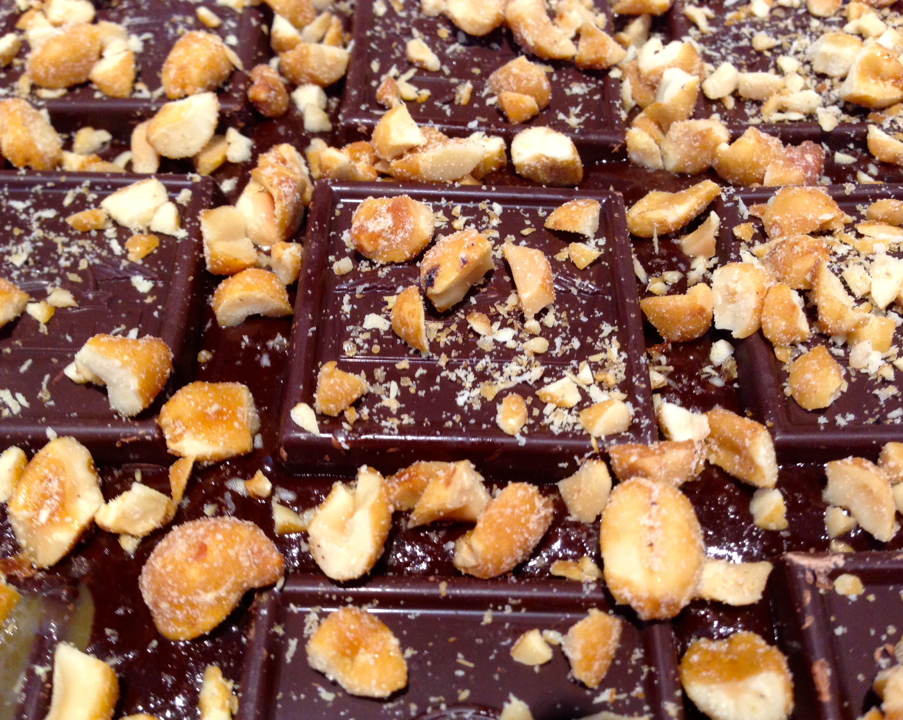 Sprinkle the peanuts on top. Let cool until the chocolate hardens. Cut into bars and serve. Keep in a airtight container for up to three days.