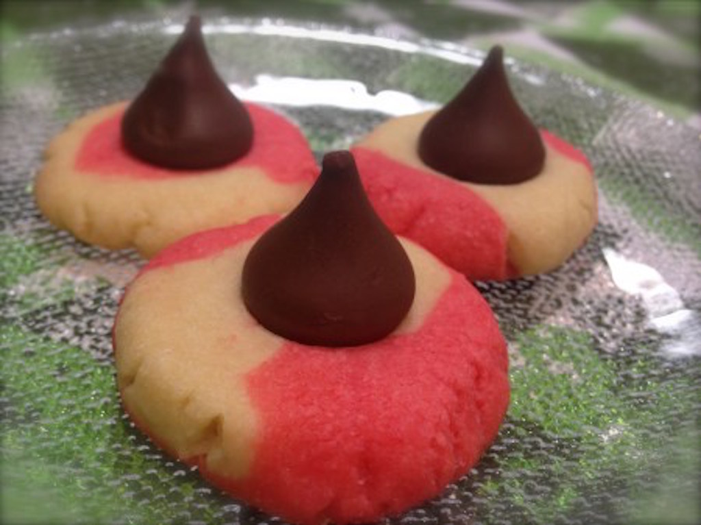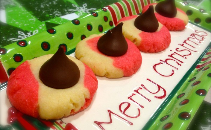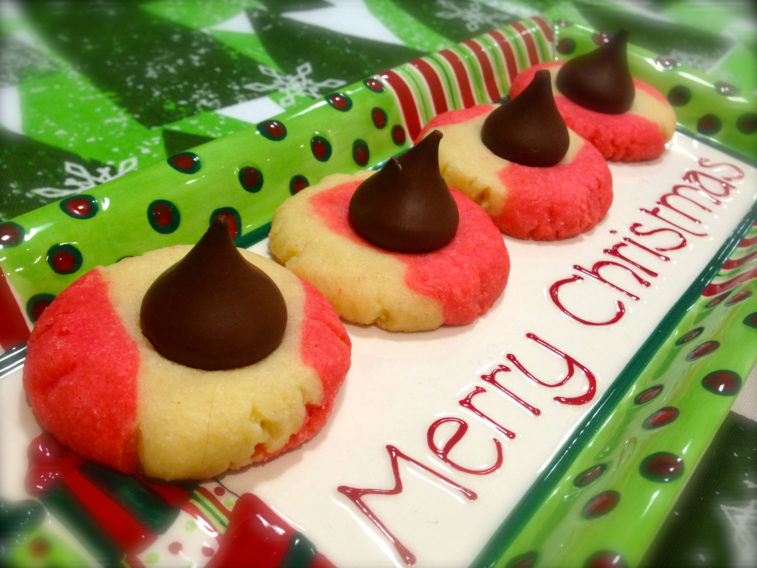 No respectable holiday cookie compilation would be complete without something that looks and tastes like peppermint. These cookies fit the bill. My peppermint twist kisses cookies not only boast the holiday colors but also bring together that great holiday combination of peppermint and chocolate. These cookies tastes divine and dress up any holiday cookie tray.