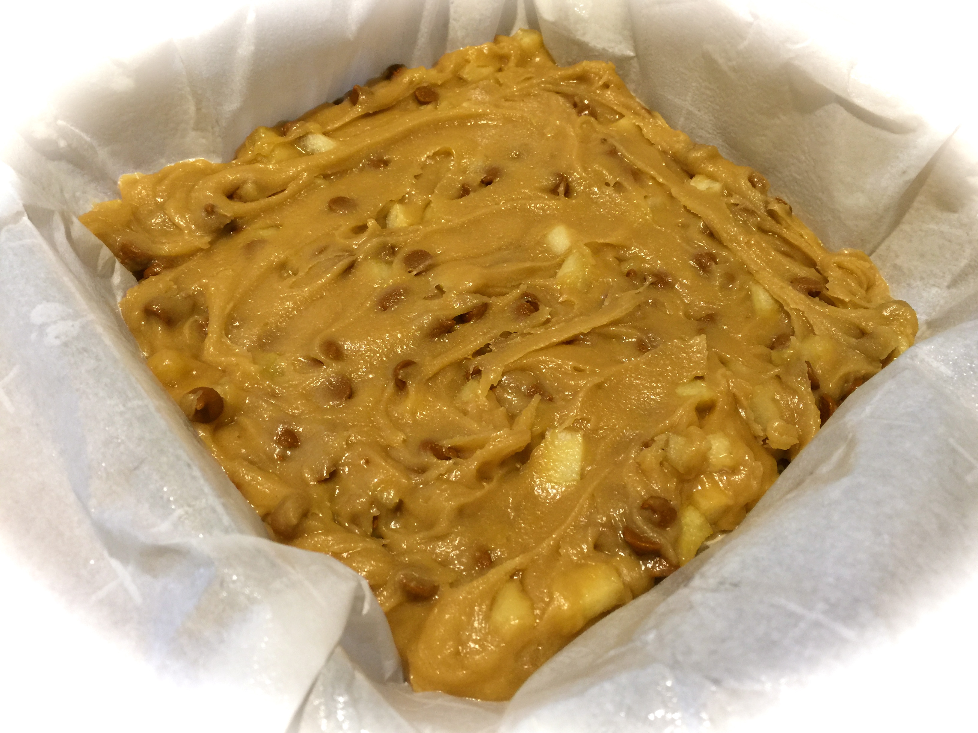 Lesson Learned 1: Perhaps the hardest thing about this recipe is preparing the pan. The recipe calls for lining a 8 inch square pan with parchment paper allowing some overhang on both sides. Trying to keep parchment paper from popping back out of the pan when you allow for overhang can be tricky. I found the easiest way to make the parchment paper behave is to take two heavy cans of anything and weigh down the paper in the pan while making the dough. That way when it’s time to spread the dough out on the bottom the paper has been somewhat trained and doesn’t jump around as much.