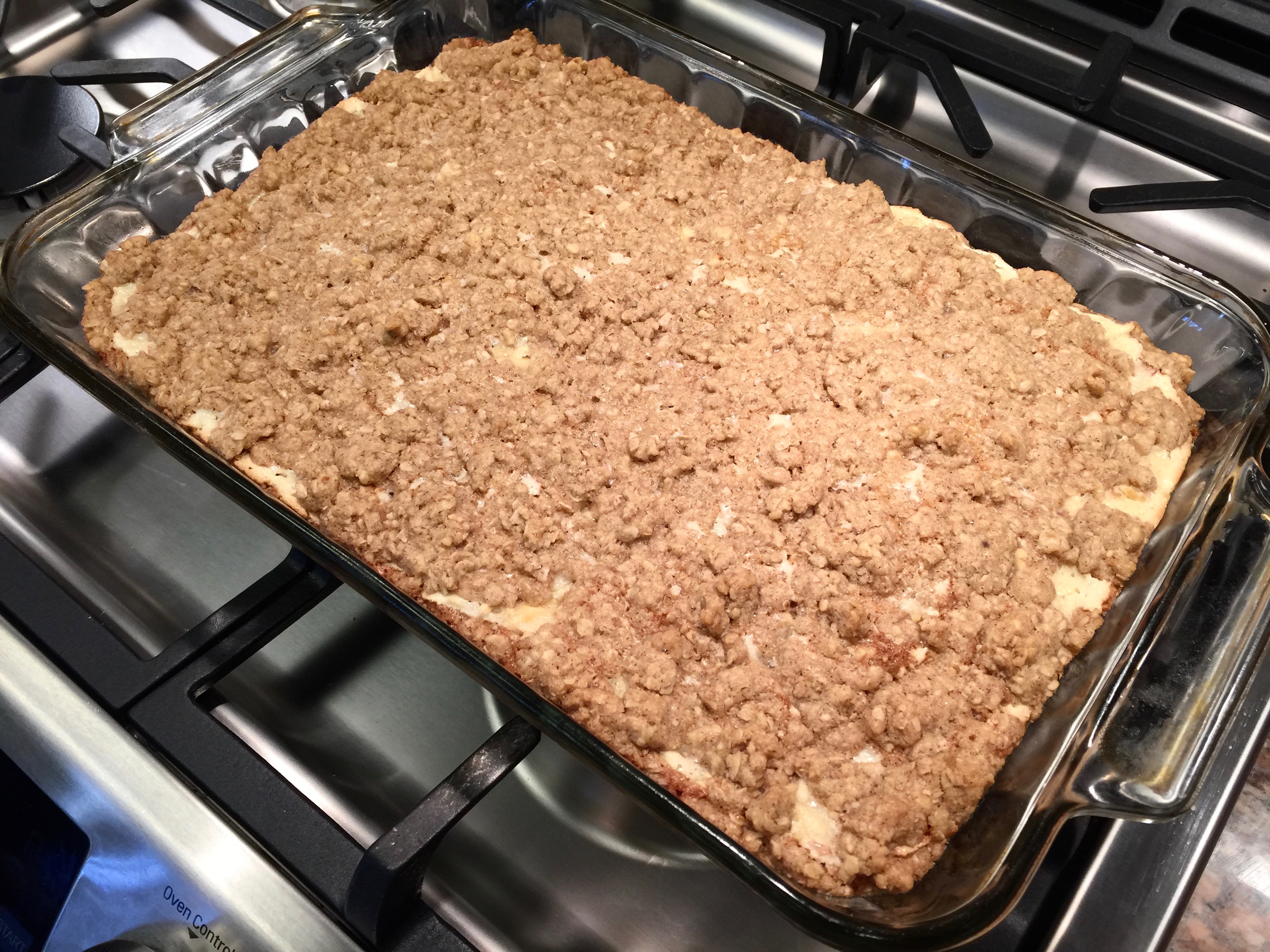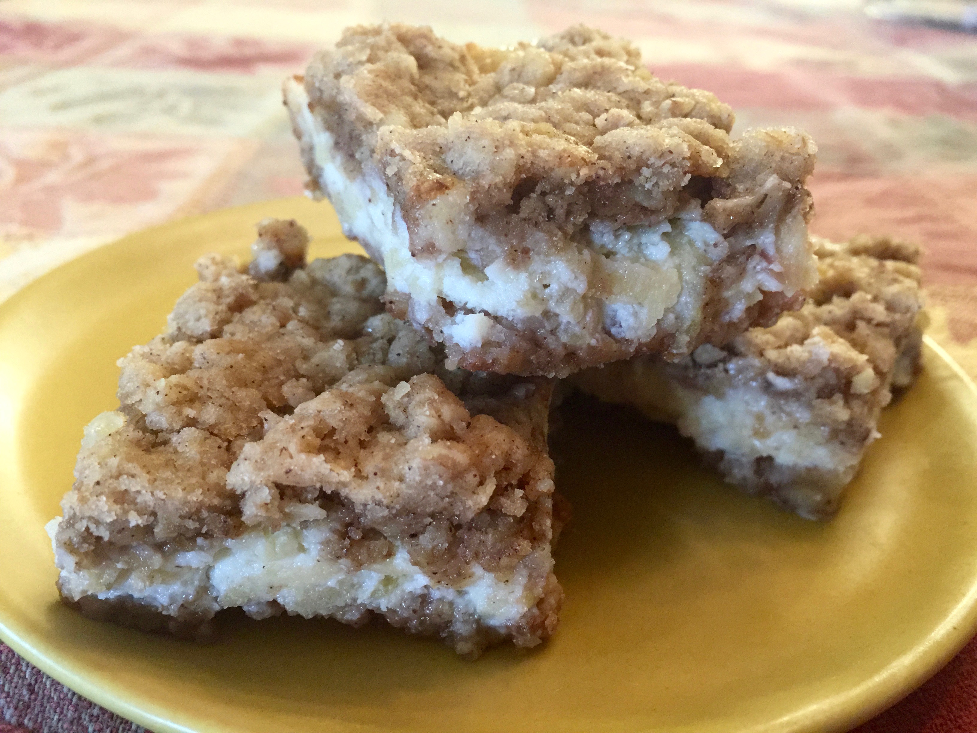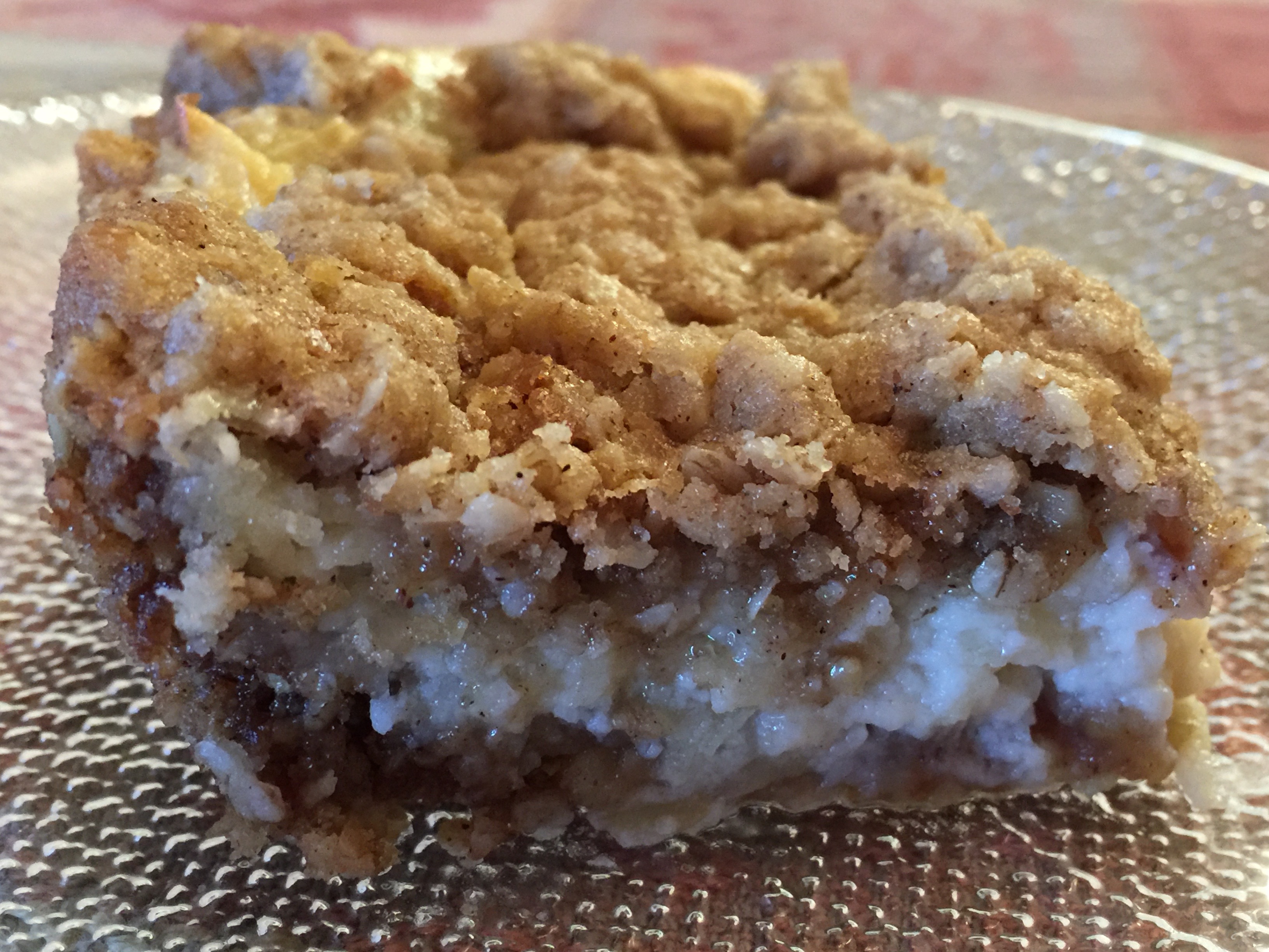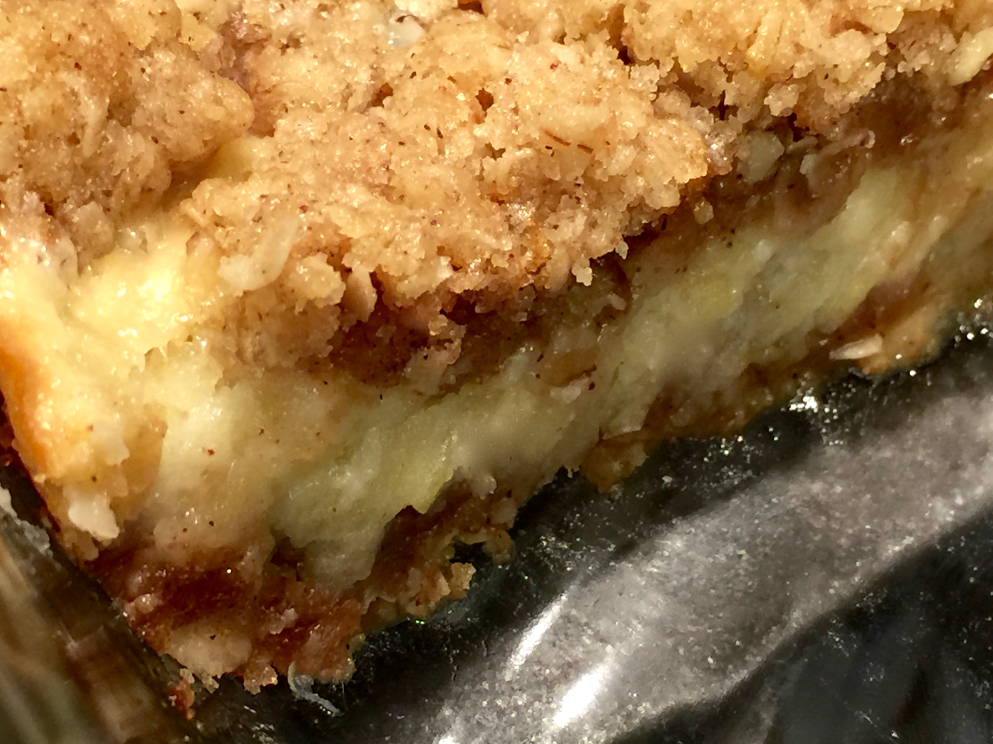 Return the pan to the oven and bake until the filling is bubbly and the crumbled topping is firm and lightly golden, about 25 – 30 minutes.  Let cool before cutting into squares.