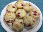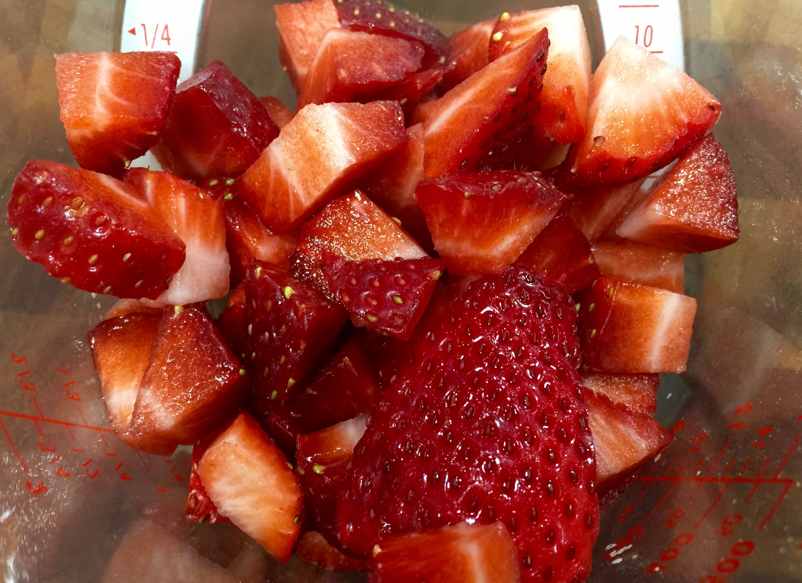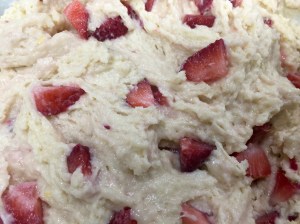 Lesson Learned 1 – Don’t cut the strawberries in too large of chunks: Strawberries give off a lot of moisture when they’re baked so you don’t want large chunks of strawberries in your muffins. That will make the muffins soggy. I cut the strawberries in half and then in half again. After that I cut the remaining pieces in thirds. The picture below gives you somewhat of a perspective on size. Just to the right of center and near the bottom is a strawberry cut in half from top to bottom. You can see the other pieces are smaller by comparison. You want to cut the strawberries into these smaller sized pieces.