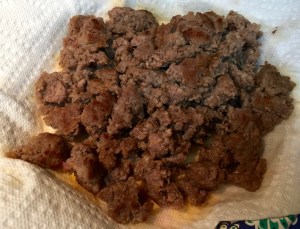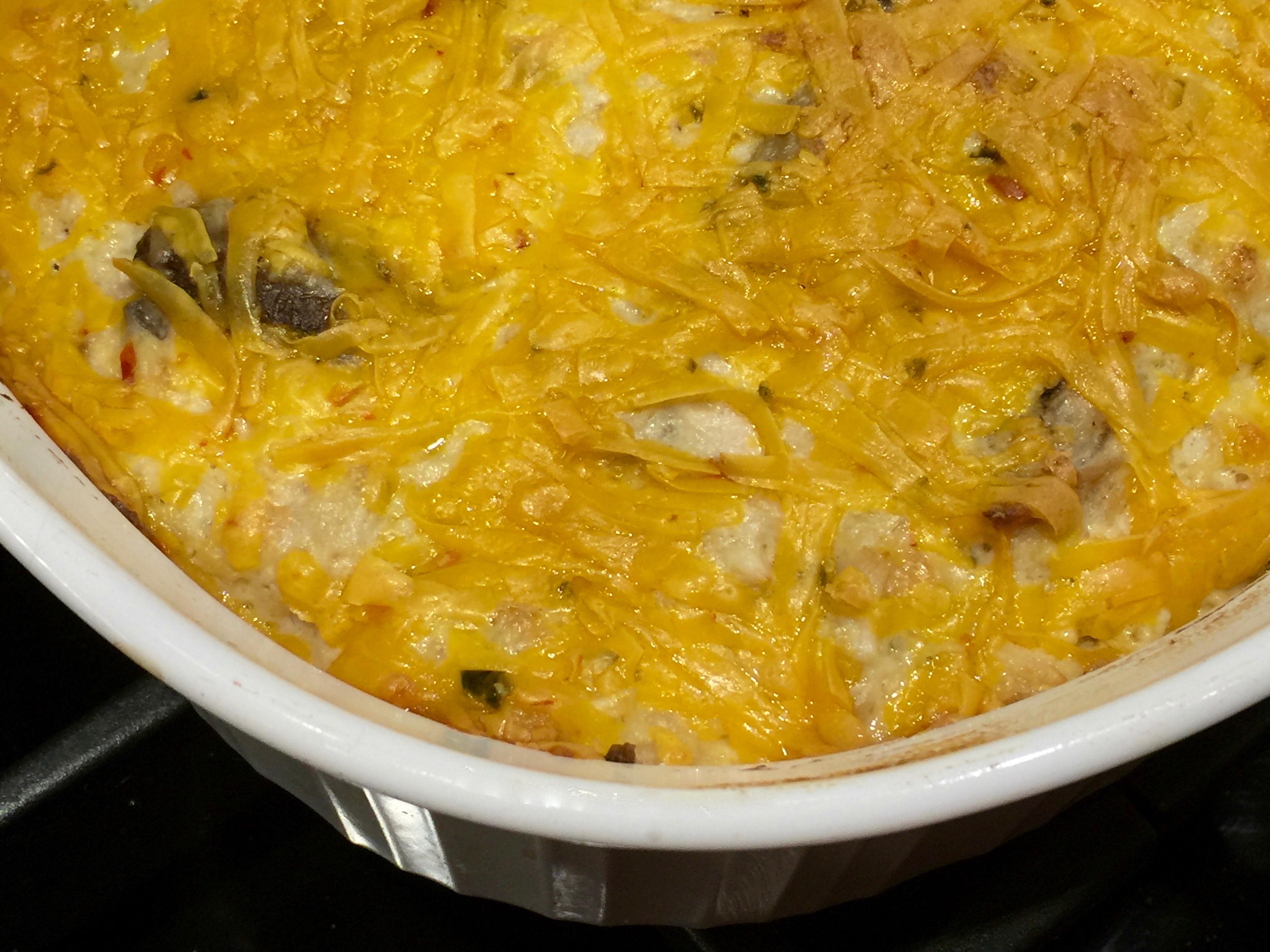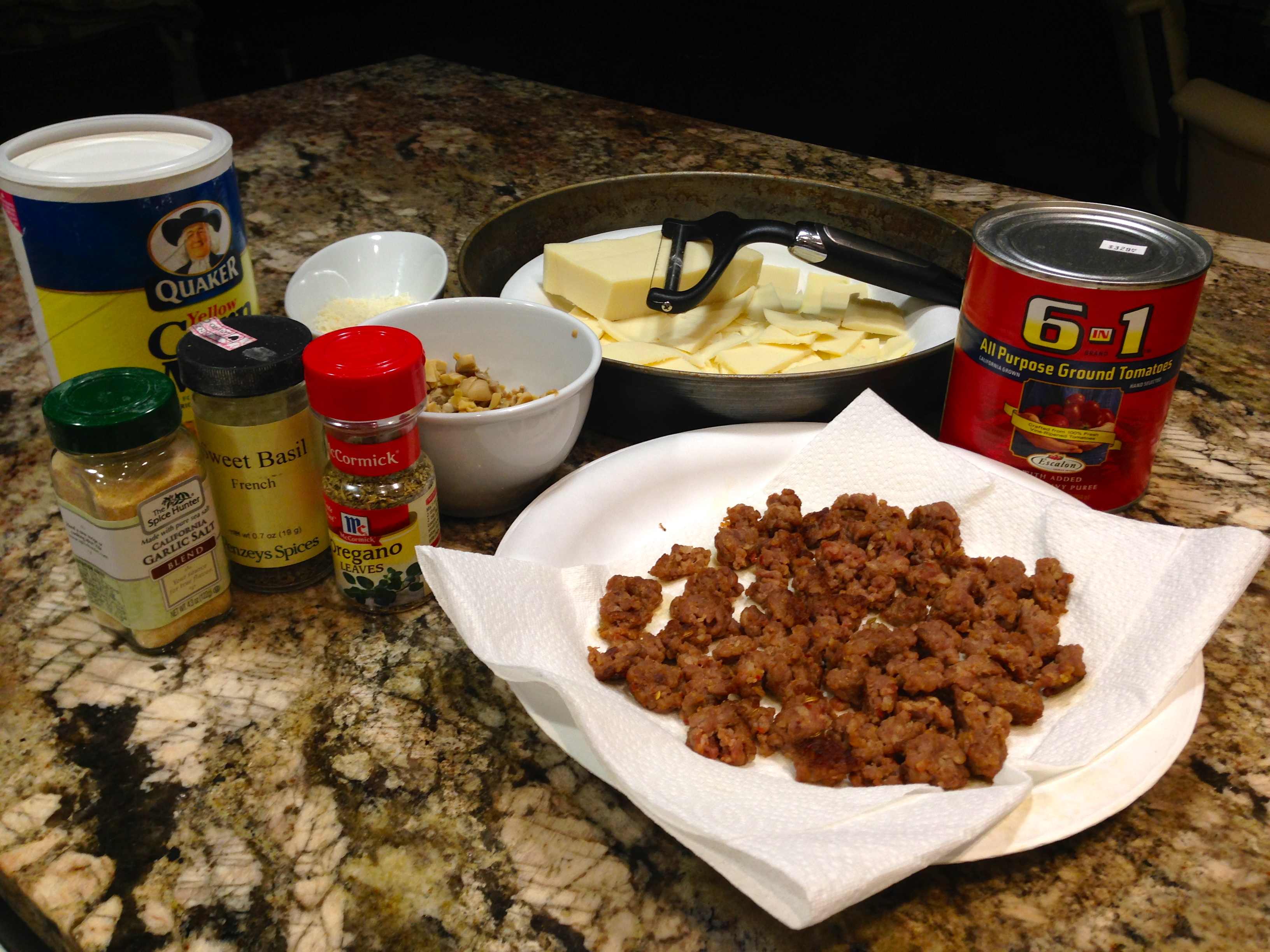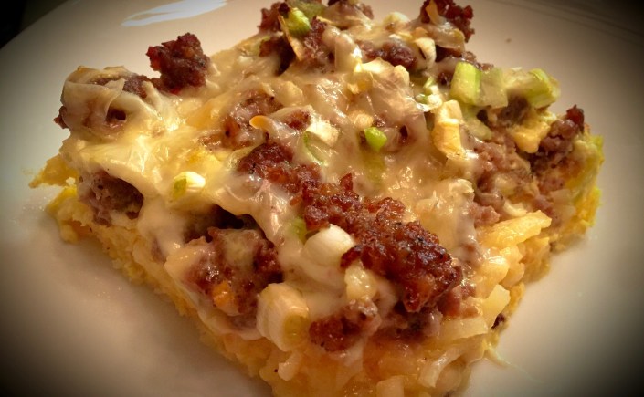 Lesson Learned 1 – You probably will not need an entire tube of breakfast sausage: This recipe is made in an 8 x 8 pan and serves four. Double it if you want to make it in a 13 x 9 pan. In the smaller pan you probably will not need the entire tube of sausage. Use as much as you like and if you are a true meat eater use the whole thing. We only needed about three quarters of the tube. We froze the rest to use later.