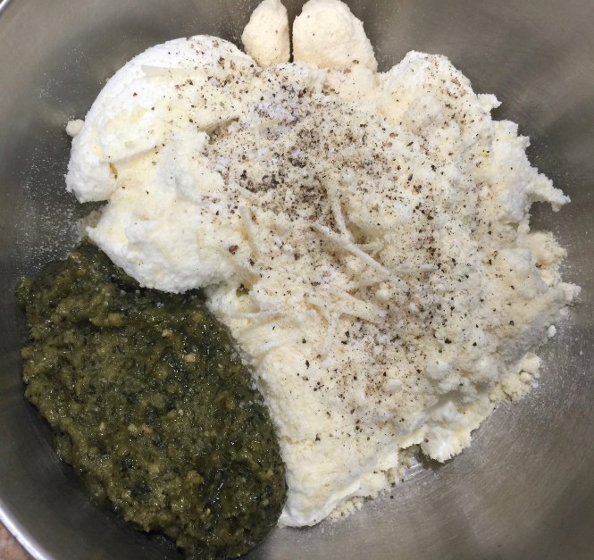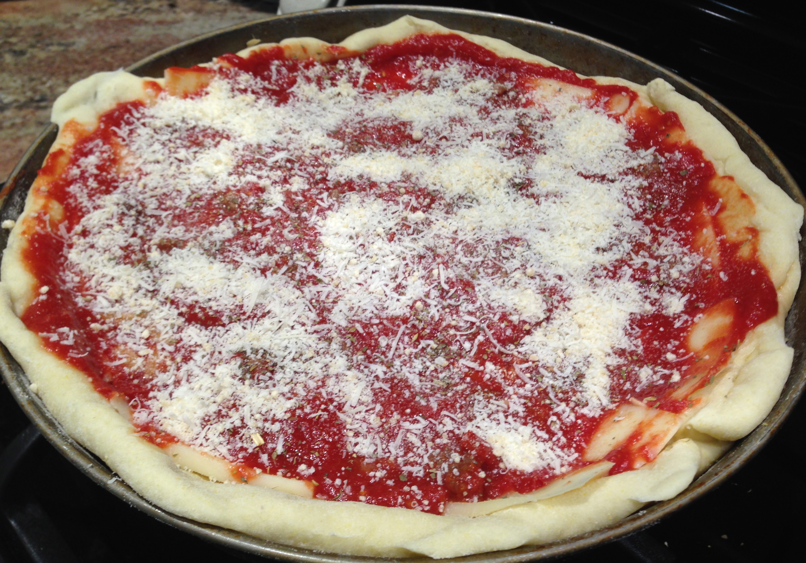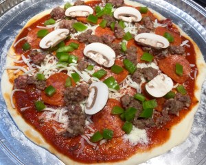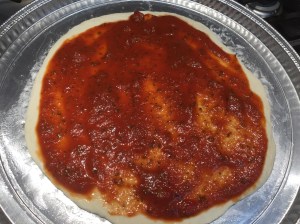 Lesson Learned 3 – Don’t drench the pizza with sauce: I used the smallest jar of marinara I could find, 14 ounces, and I still didn’t use all of it. Now you may ask should I use pizza sauce or pasta sauce. I don’t think it really matters. Some make pizzas with alfredo sauce. I don’t think there is a hard fast rule. It’s really all up to you. What’s more important is to make sure you don’t drown your dough in sauce. Just spread it on to lightly and evenly cover it. You don’t want to create soggy dough.