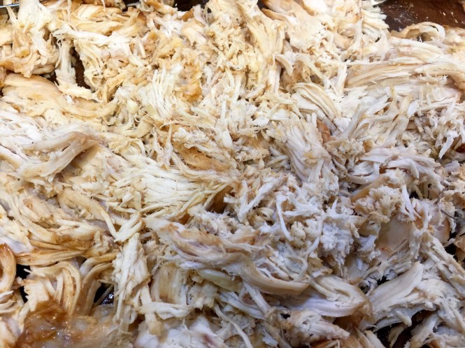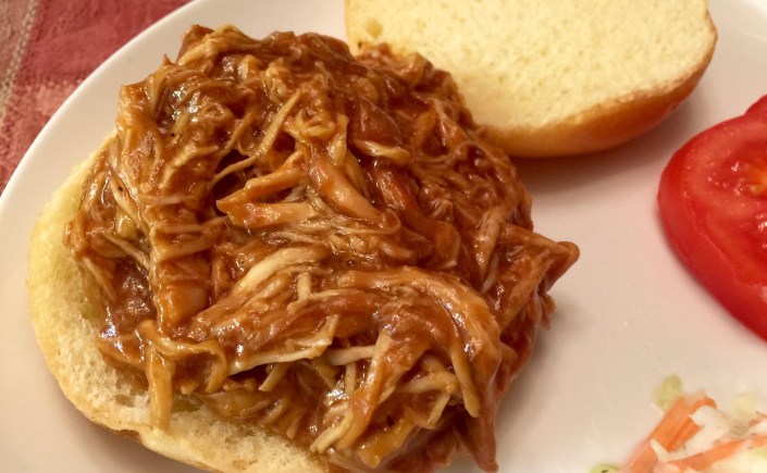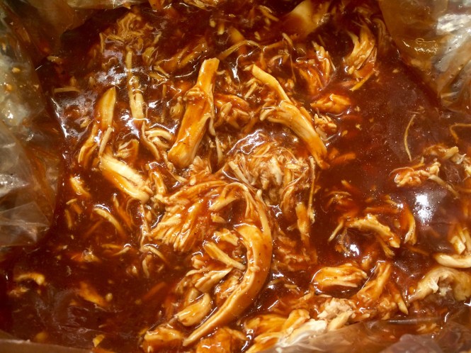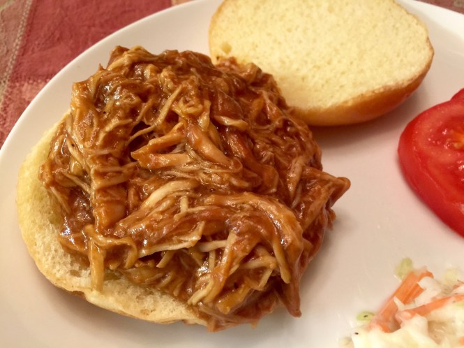 Lesson Learned 4 – You can cook a veggie with the chicken if you want to: The first time I made this recipe I only cooked the chicken in the bbq sauce mixture. The second time I added carrots. When it came time to shred the meat I just pulled out the carrots, put them on a baking sheet lined with foil and sprayed with cooking spray and kept them in a warm oven until dinner was served. Make sure you use cooking spray on the foil as the remnants of the bb sauce on the carrots will stick to the foil and you don’t want the carrots sticking. Also make sure you don’t use overly thick carrots – they won’t cook through in six hours.