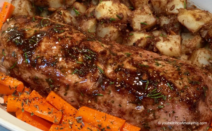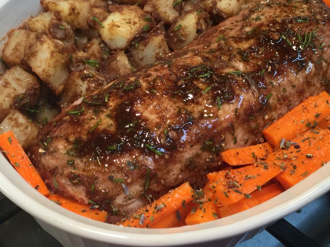 Lesson Learned 1: Slightly par boil your potatoes before roasting them: I don’t know about you but I’ve found that roasting potatoes can be tricky. I usually wind up with hard or semi hard potatoes that are not cooked through. In this recipe it is important to cut the potatoes as evenly as possible (mine were approximately one inch squares). Once I do that I put them in a pot with water, bring the water to a boil and boil the potatoes for about 5 minutes or just until they start to turn tender around the edges. Then I drain the potatoes and let me cool slightly in the strainer. I’ve found when I do this my potatoes come out perfectly when making this recipe. After I strain off the water I transfer them into a bowl so that I can coat them with the balsamic mixture before putting them in the roasting pan. It’s a little extra work, but definitely worth it.