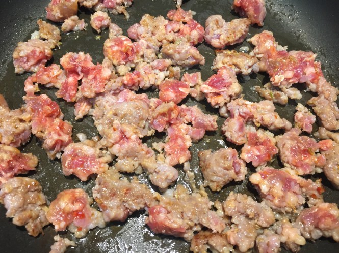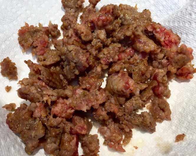 Lesson Learned 1 – I used ground italian sausage but you can also use prosciutto: My husband needs to eat foods that are easy to chew and so I used ground italian sausage. If you choose to use prosciutto, use about 5 thin slices. Add them to the onions once they are translucent and cook them until they are crisp. Then follow the remainder of the recipe as is. I guarantee it will be equally as good.
