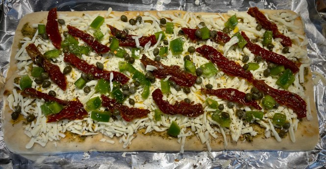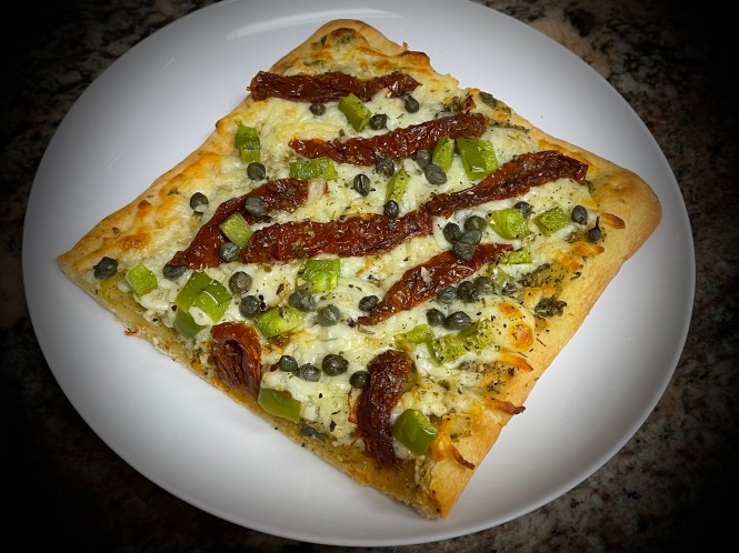 - The measurements in the recipe are guidelines: I find it hard to put measurements into a recipe like this because so much is done by sight and taste. If you want more cheese on your flatbreads than put it on. The same goes for the tomatoes, and green pepper. With the capers, I would err on the lighter side as they give a nice briny taste to the pizza but could overpower the other ingredients if there are too many. Just my opinion.