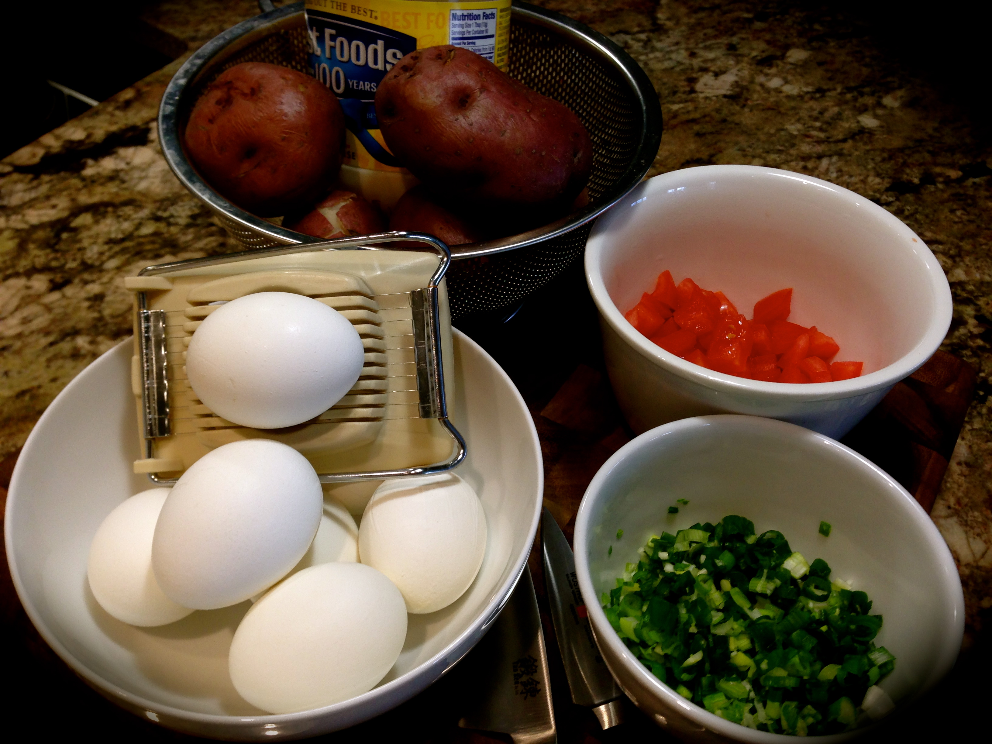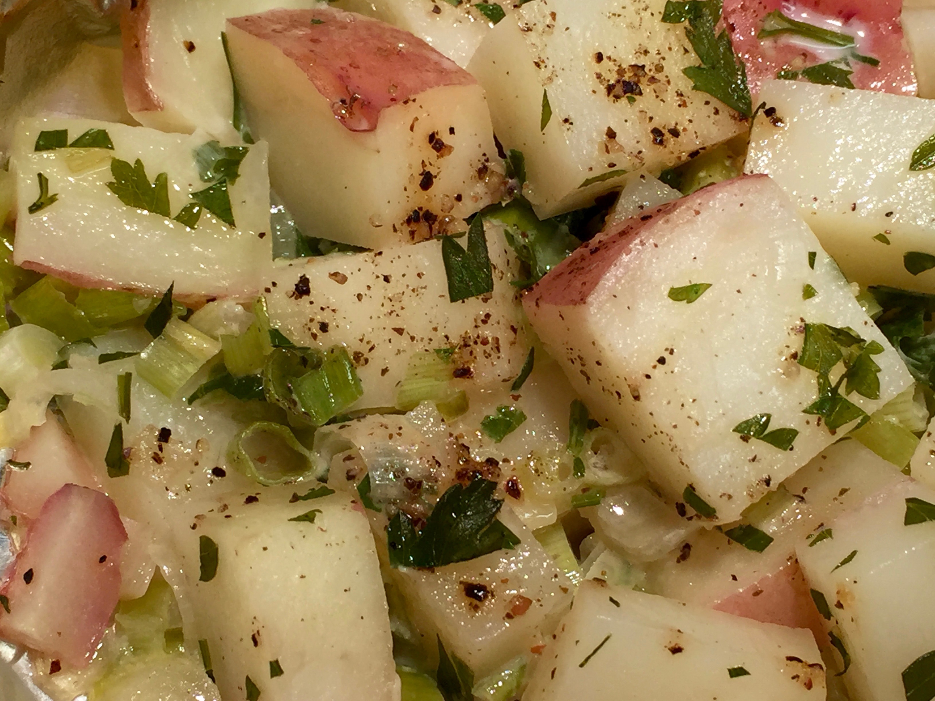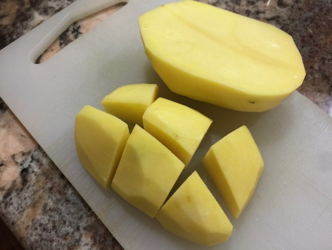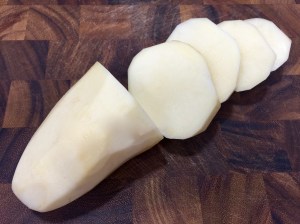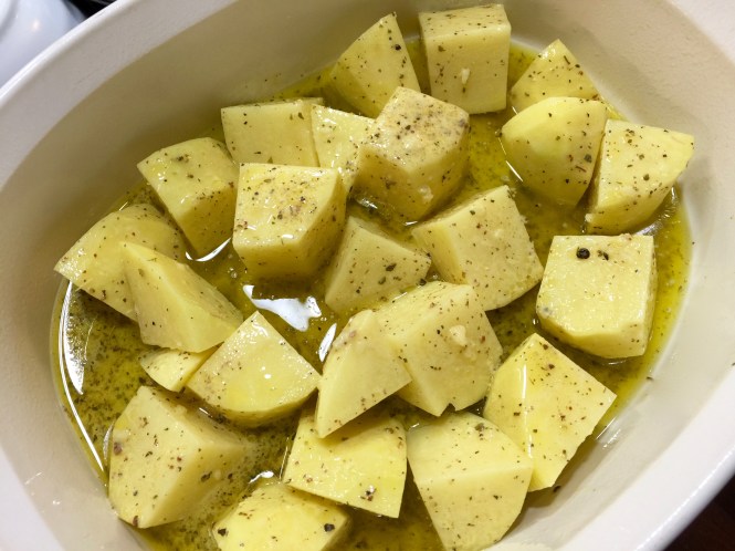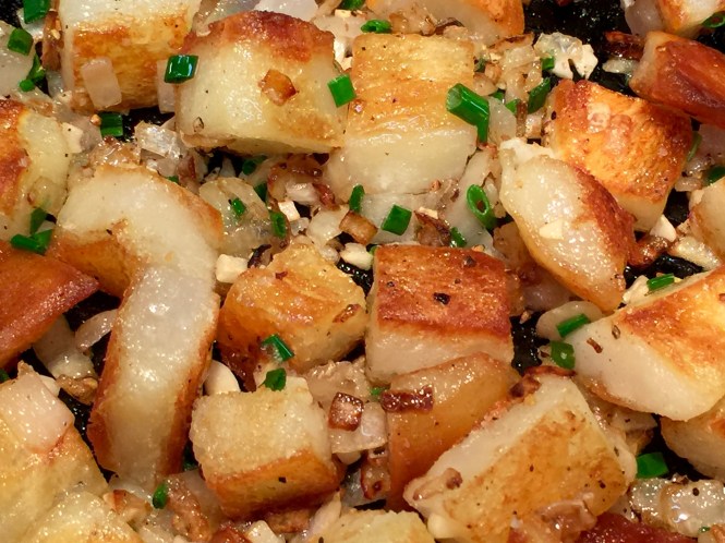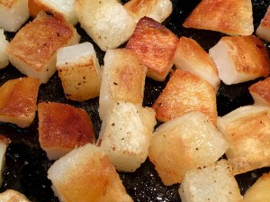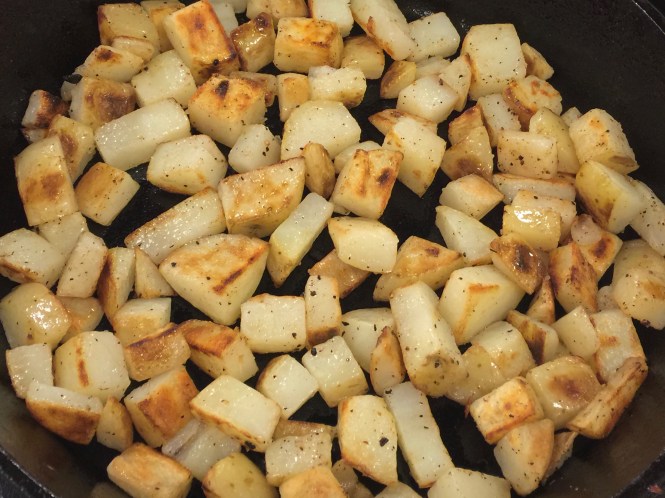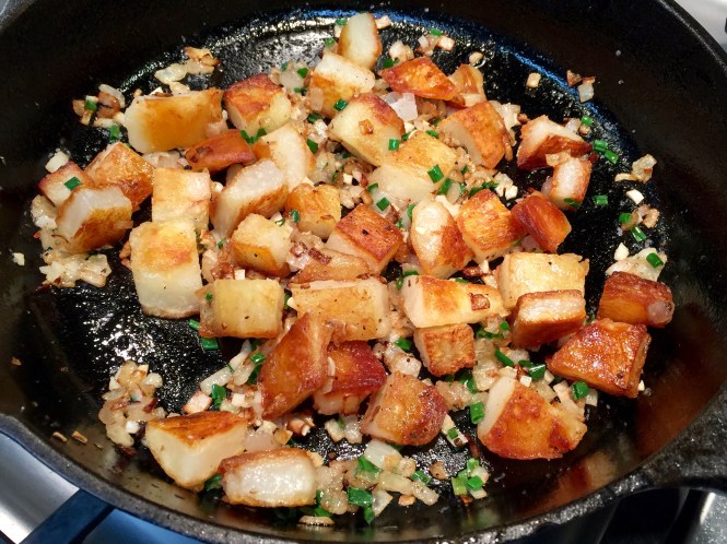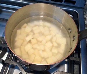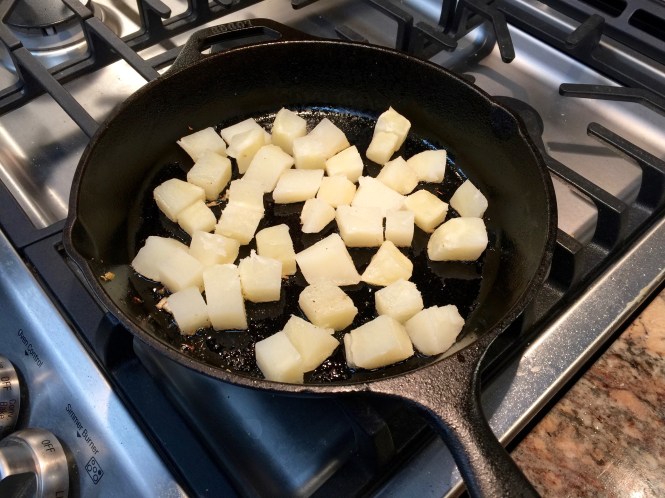 Lesson Learned 5 – Cut the bacon into lardons and cook until brown but not crisp: You want the bacon to have good color but you don’t want it so crispy that it won’t hold its shape when you mix it with the potatoes. So cut your bacon into lardons, as shown below, and cook them until they have a nice deep rich color.