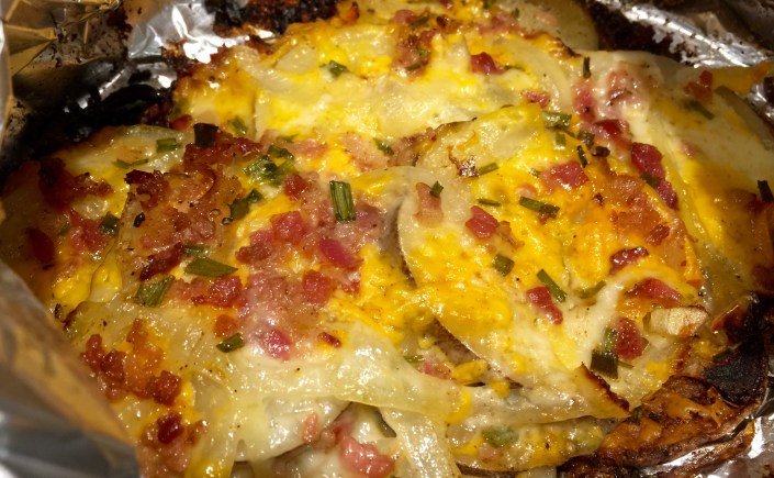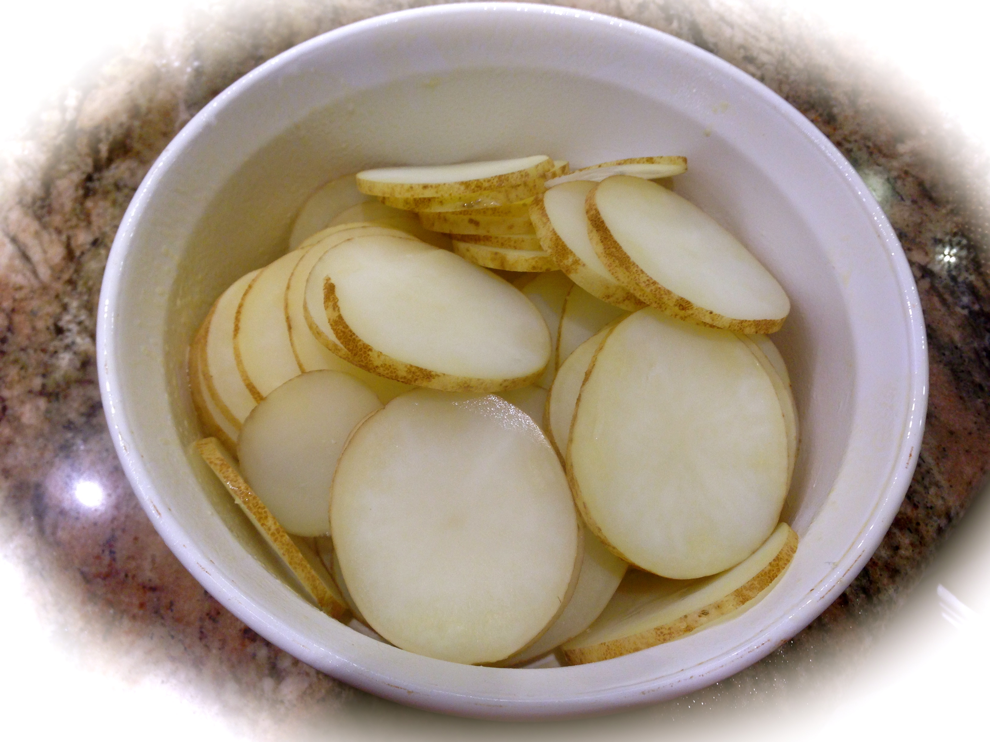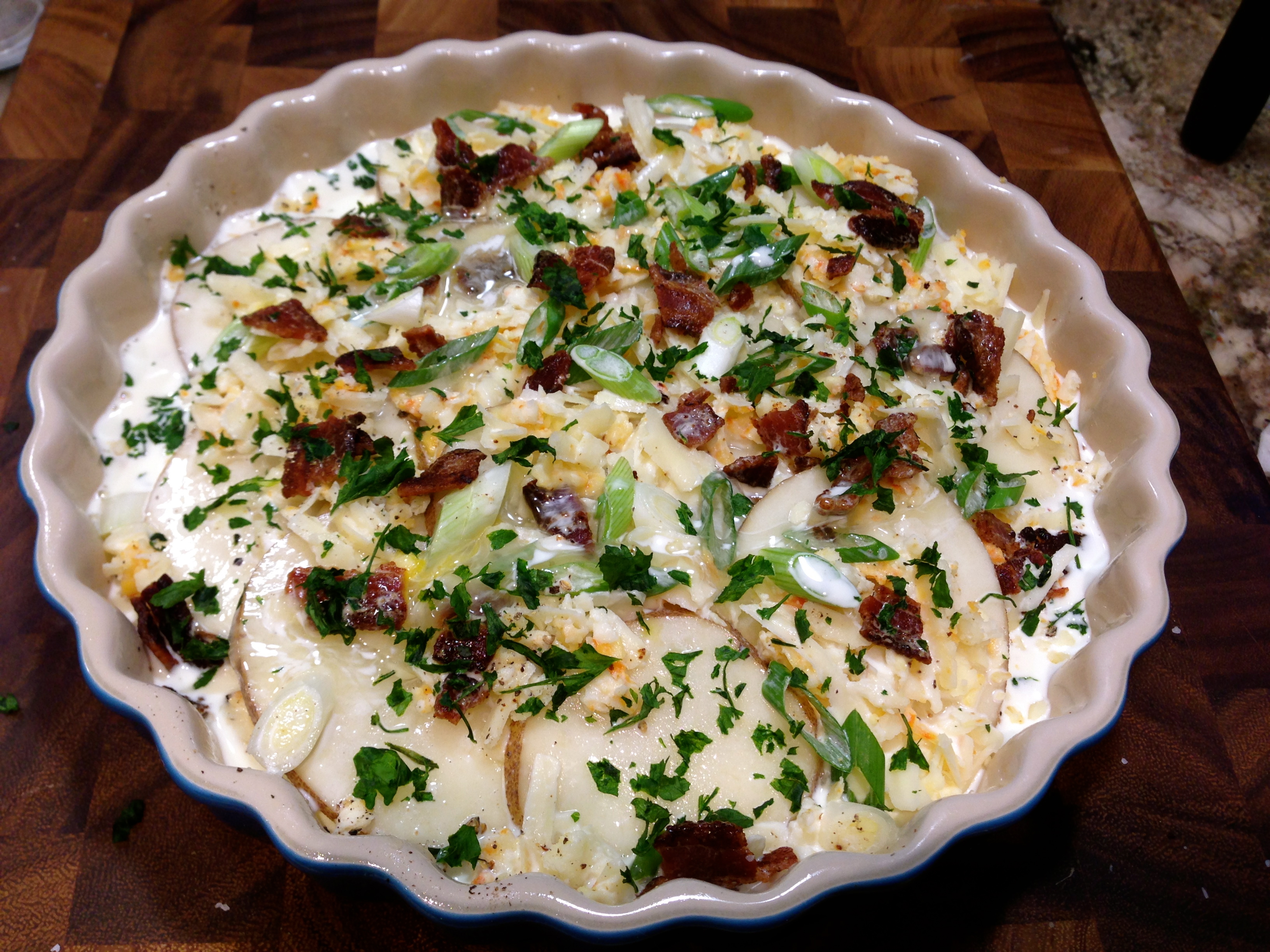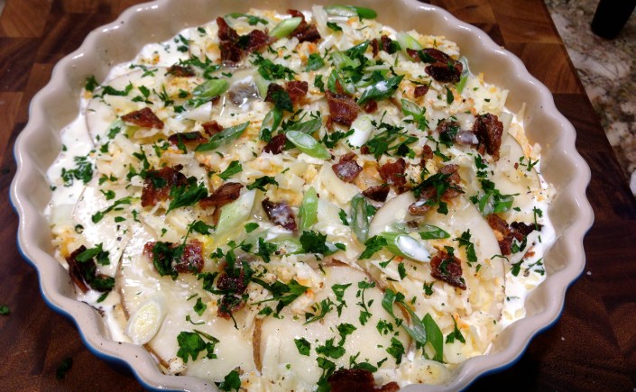Preheat the oven to 375 degrees. Sauté the bacon and butter together. Set aside. Peel the potatoes and place into a large bowl of water until ready to use.