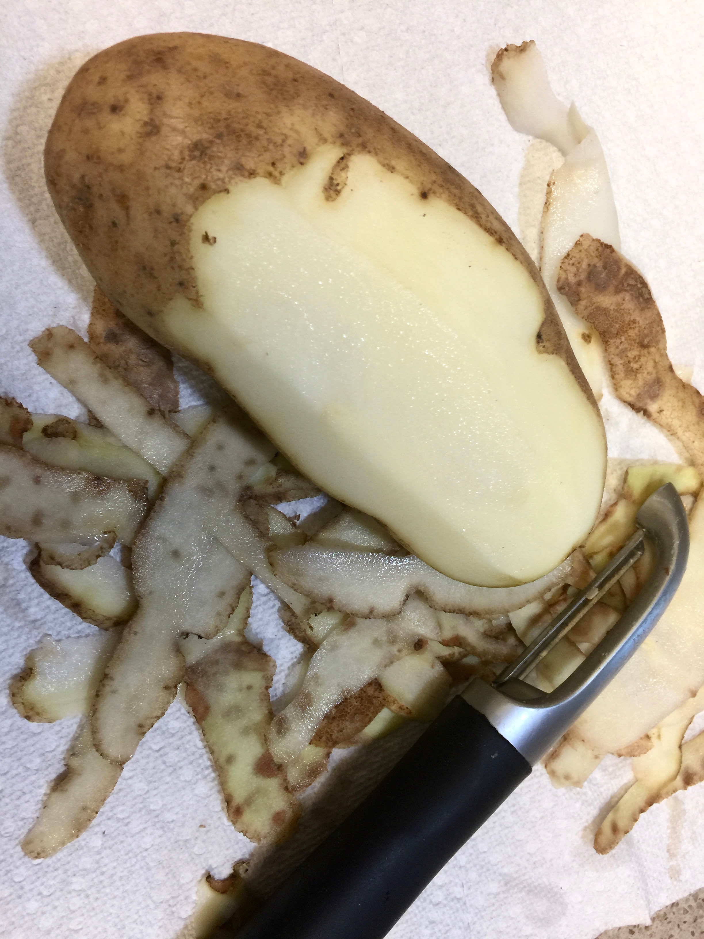 The last thing you want to have happen is for the potatoes to oxidize and turn brown while waiting to be grated. Once you peel them put them in a bowl of cold water until you are ready to grate them. That way they will not turn brown on you.
