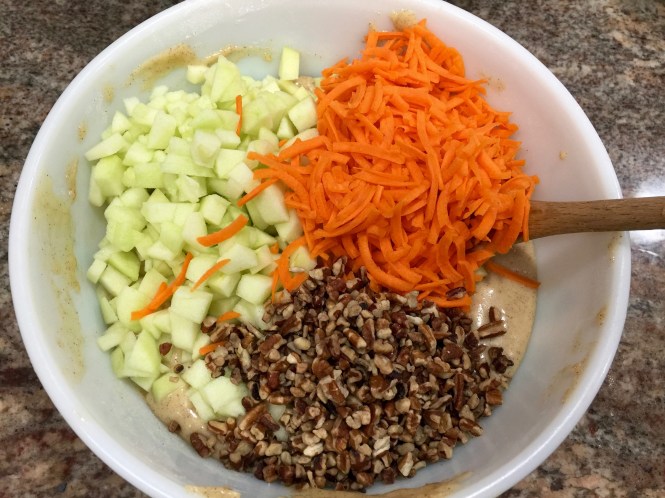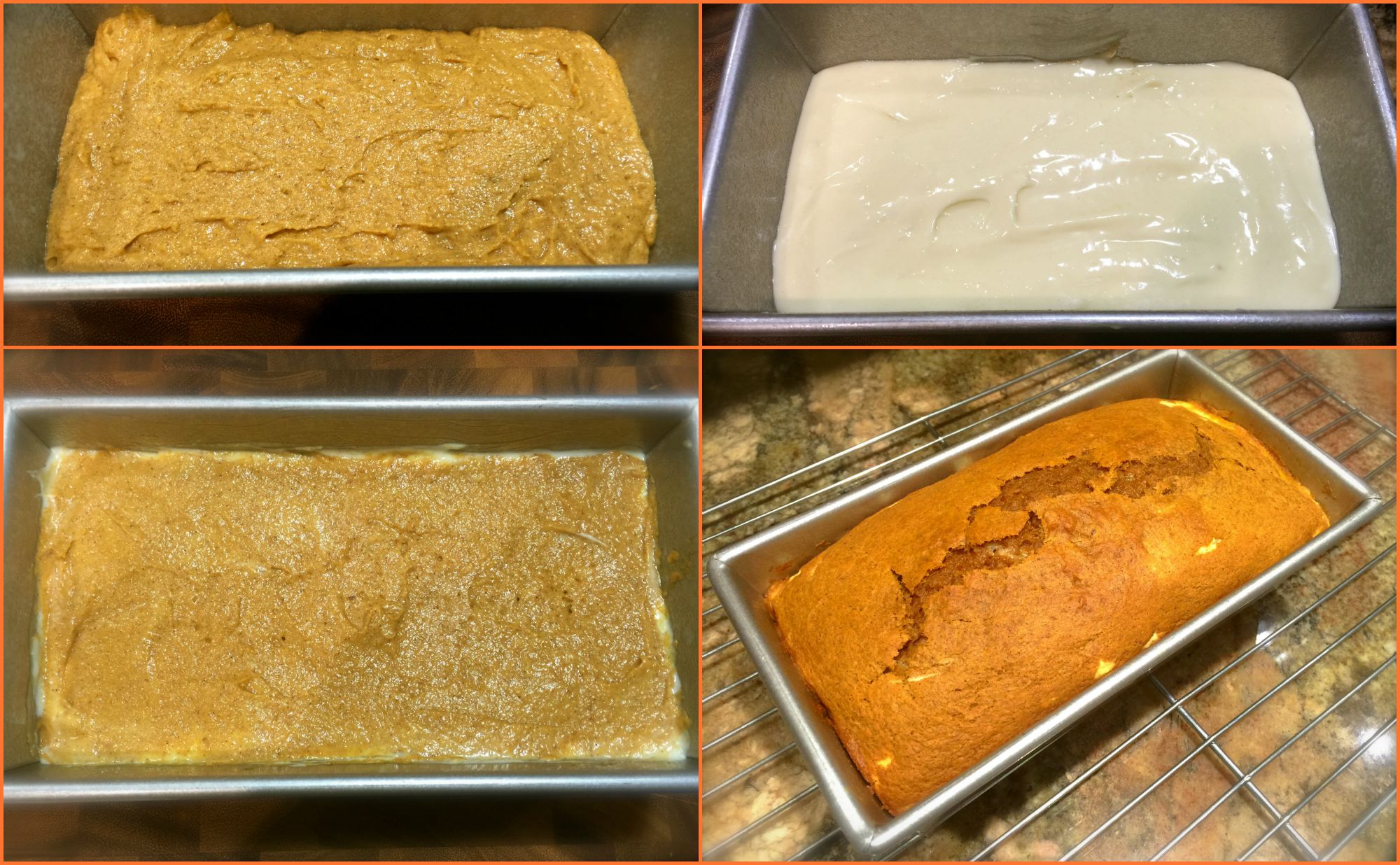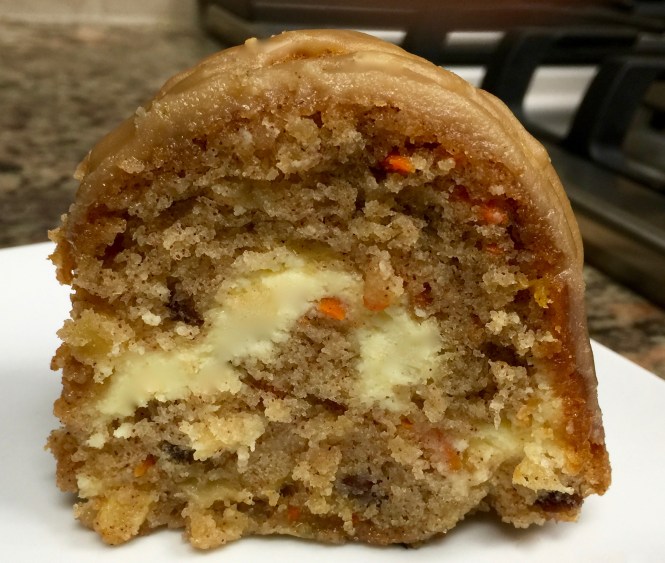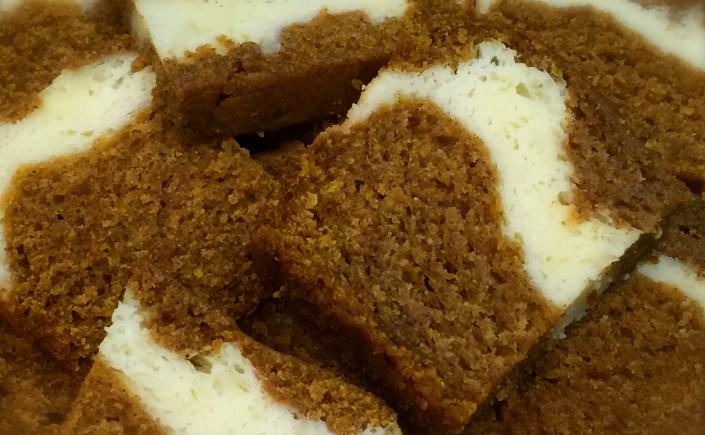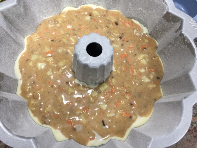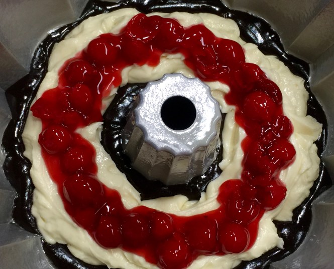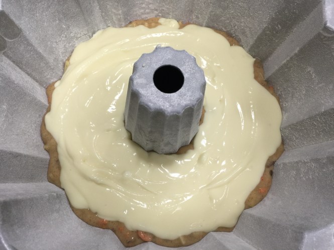 Lesson Learned 2 – The cake batter is thick: This batter creates a nicely dense cake that is balanced out by the cream cheese layer. But a dense batter can be a challenge to spread around when it comes time to put it in a pan. I’ve learned over time that when you work with a dense batter it’s better to drop it in the pan in spoonfuls all around the pan. That way when it comes time to spread the layer most of the batter is already in place and you can spread the batter around more easily.
