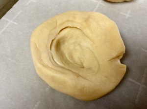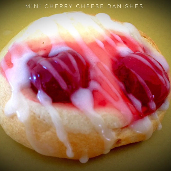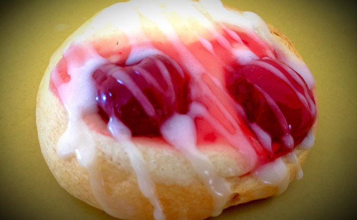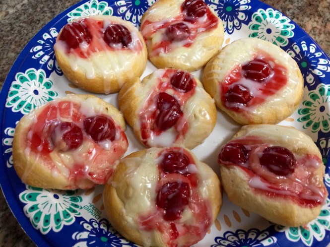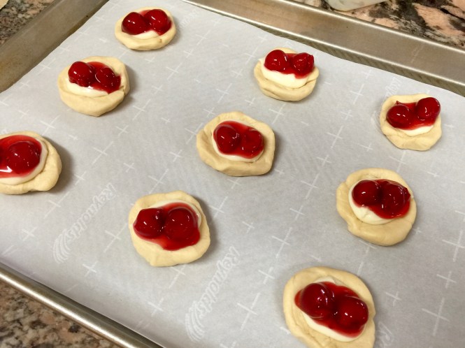 Lesson Learned 1 – Working with the refrigerator dough: Using this kind of dough is very convenient but you do have to work it a little bit. I cut the pieces along the pre-perforated edges as best I could (I wound up with 9 rounds and I should have only had 8 if I followed the perforations exactly – oh well…) and rolled each piece into a ball. I flattened each piece with my hand and then used my thumbs to create a crater inside the dough. The crater is important because that’s where you put the cream cheese and cherries. Making the crater as deep as possible helps to prevent the cherries from falling off. But don’t worry, if they do once you pull them out of the oven just use a small spoon to push them back on top. Once they cool they will stay put.