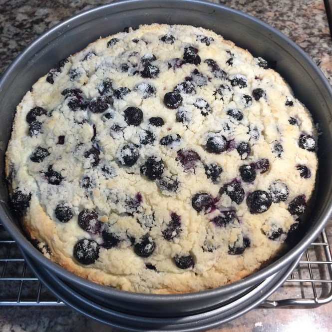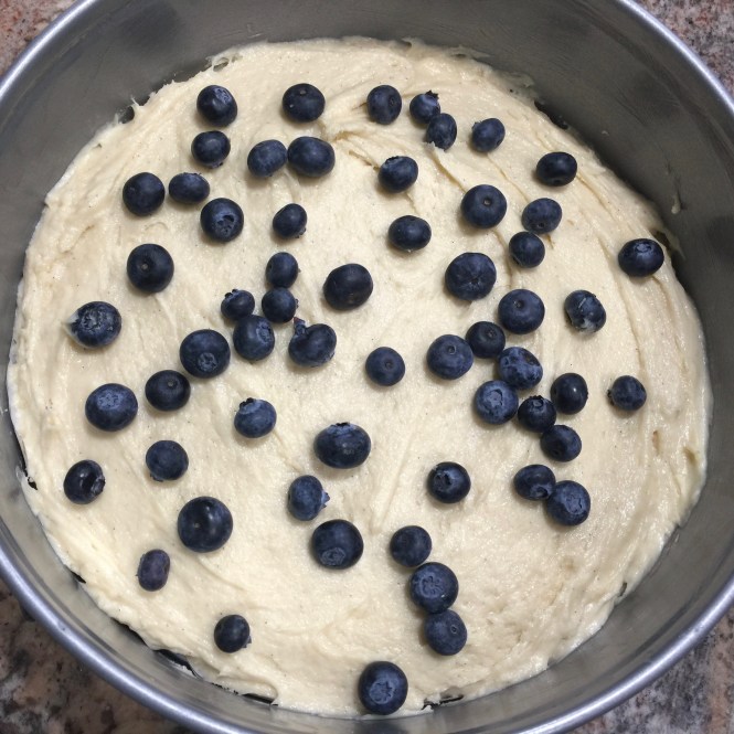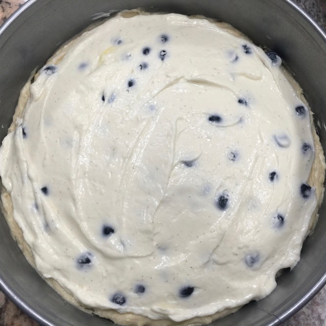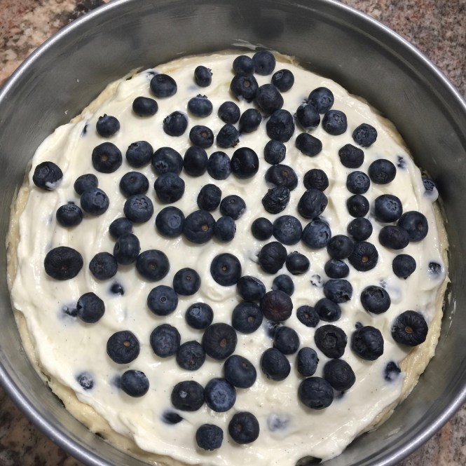 Lesson Learned 4 – Arranging the blueberries in the layers: This cake requires two blueberry layers, one on top of the cake batter layer and one on top of the cream cheese layer. When putting in both layers be careful to not let any of the blueberries touch the sides of your spring form pan. If you do you’ll find it difficult to clean the sides of the pan after baking. If you don’t you can still clean the sides of your pan, it’s just a little more difficult even though the pan has been greased.