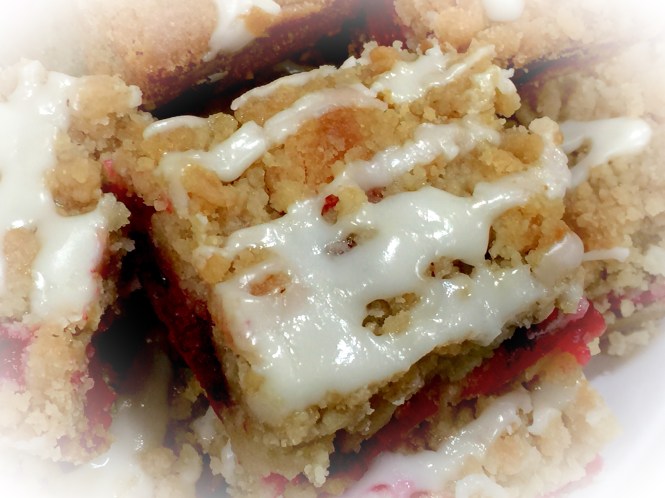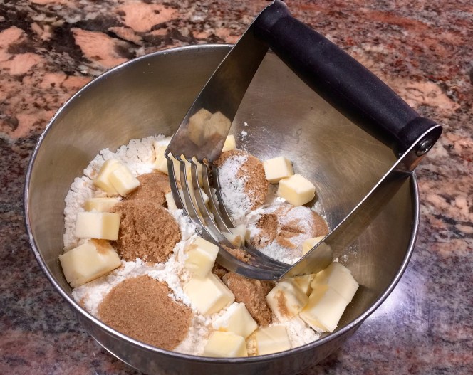 In a medium size bowl, put in all the crumble ingredients and cut together with a pastry cutter until the mixture is all combined and resembles clumps of sand. Set aside.