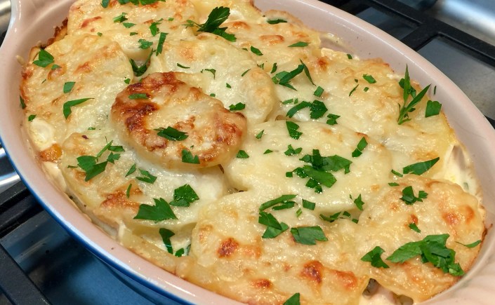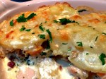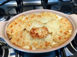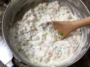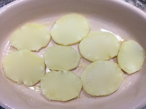 Lesson Learned 3 – Those tricky potatoes: I don’t know about you but, for me, potatoes are tricky when using them in a casserole, specifically sliced potatoes. I’ve experienced many instances where they were hard and not cooked through. This time they turned out perfectly. This is what I did. I used two medium sized yukon gold potatoes and boiled them with their skins on until I could easily stick a fork in them. Then I put them in a colander and let them cool. It is important to let them cool. If you try to cut them when they’re hot they’ll fall apart. Once they cool you can easily peel and slice them. Can you leave the peel on? Of course you can. My husband prefers them with the peel off. I sliced potatoes into half inch thick rounds and they were delicious. One of the first things my husband said when he took is first bite was, “the potatoes are good”. Success!!