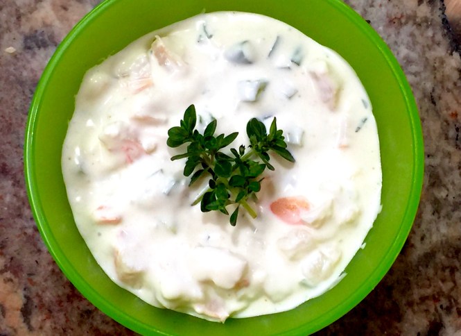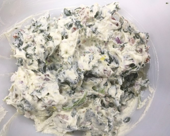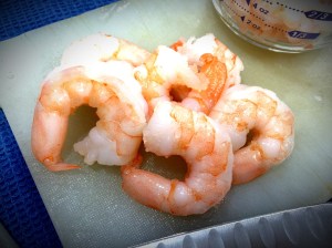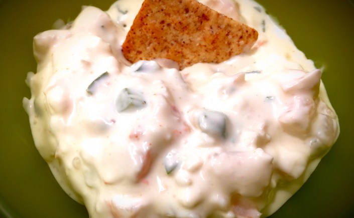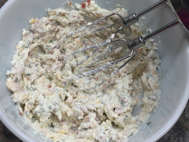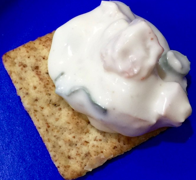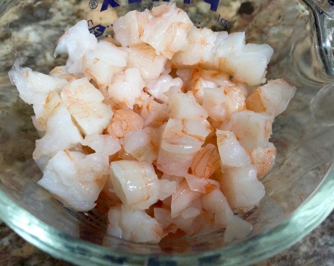 Lesson Learned 1 – Use LOTS of shrimp: I used a 12 oz. bag of frozen cooked and deveined shrimp. I thawed the shrimp in the refrigerator overnight and then chopped it up into small bite sized pieces. I kept a couple of shrimp to garnish the top of the dip (of course you don’t have to do that) and all the rest went into the dip. My point being this is a shrimp dip – the more shrimp the better.