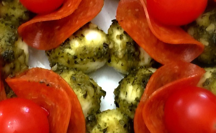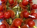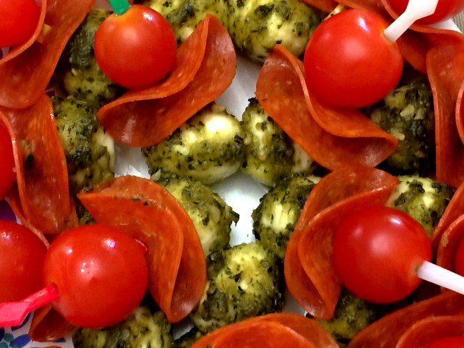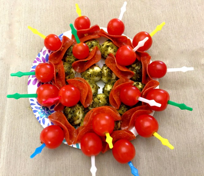Lesson Learned 2 – If you want to serve these standing up versus lying down you will need to cut a flat surface on the bottom of each mozzarella ball: I learned this lesson the hard way. I started assembling the skewers and found that they would not stand straight. The round bottom of the ball prevented them from doing so. I tried pushing the bottom flat but that didn’t seem to work so I started cutting the bottoms off the balls and then figured out that I liked the presentation of the skewers better with the skewers lying on their sides. So I opted to serve them lying on one side versus standing up. There is no right way to serve these, but I found that serving them on their side created quite an impressive looking appetizer as you can see from the picture below…