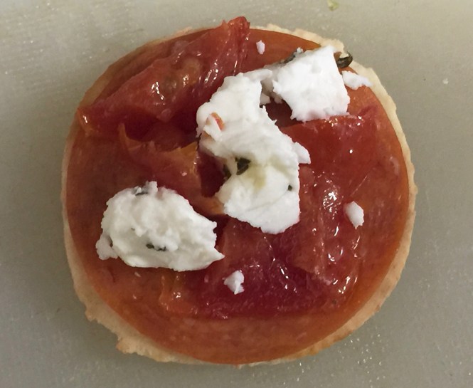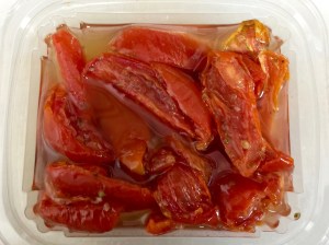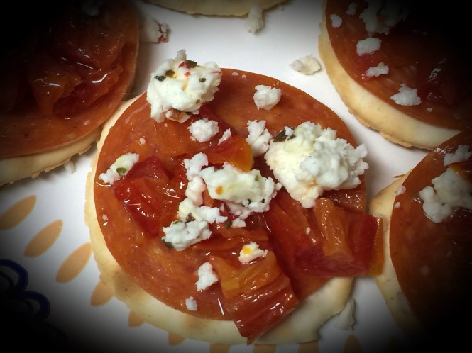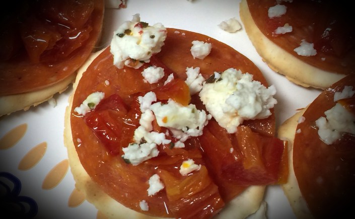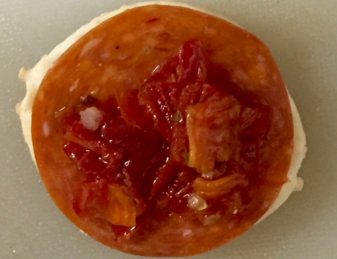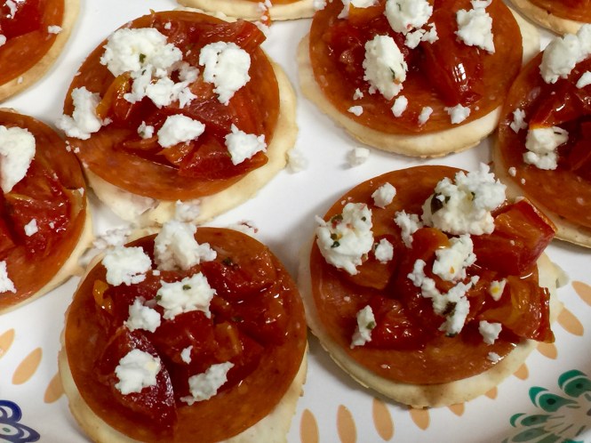 Lesson Learned 2 – I used pre-made roasted tomatoes: In the specialty cheese section I found some roasted tomatoes marinated in garlic olive oil. Bingo! The package had about 7 ounces of roasted tomatoes that I diced up and put on top of the pepperoni. It was fabulous. If you can’t find them pre-made you can roast tomatoes yourself and then let them marinate in some olive oil. You’ll still get the same result. But this was a whole lot less work and gave the bites a great flavor!
