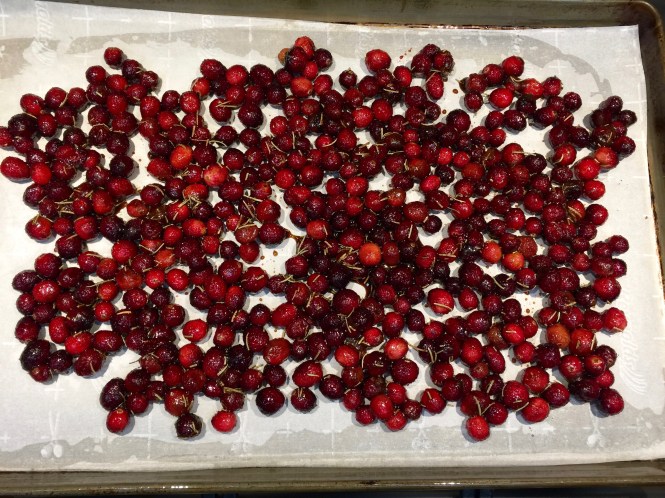 Lesson Learned 1 – Working with the refrigerator dough: Using this kind of dough is very convenient but you do have to work it a little bit. I cut the pieces along the pre-perforated edges as best I could (I wound up with 9 rounds and I should have only had 8 if I followed the perforations exactly – oh well…) and rolled each piece into a ball. I flattened each piece with my hand and then used my thumbs to create a crater inside the dough. The crater is important because that’s where you put the cream cheese and cherries. Making the crater as deep as possible helps to prevent the cherries from falling off. But don’t worry, if they do once you pull them out of the oven just use a small spoon to push them back on top. Once they cool they will stay put.