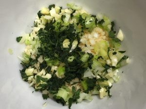 Lesson Learned 2 – Adapting this recipe: I originally wanted to use some spinach in this recipe but didn’t have it on hand and didn’t feel like going to the grocery store to buy some. But I did have some flat leaf parsley and so I used that. If you use spinach just saute it with the onions and only use a couple of handfuls. The spinach should act as the accompaniment to the recipe and shouldn’t overpower it. The same applies to flat leaf parsley. I only used a little more than a tablespoon (and of course I used some for garnish), just enough to enhance the flavor.
