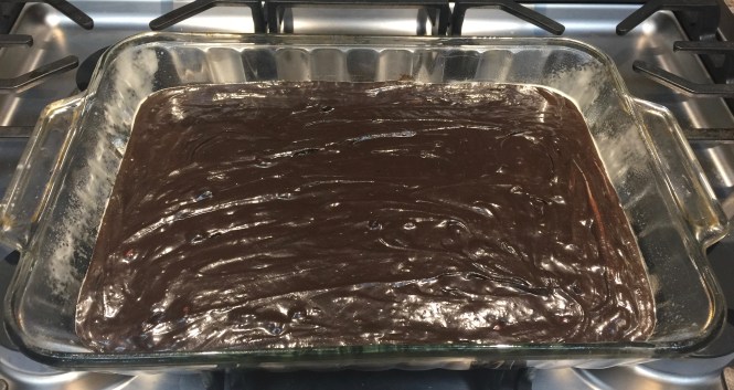 Lesson Learned 2 – The cake batter is thick: This batter creates a nicely dense cake that is balanced out by the cream cheese layer. But a dense batter can be a challenge to spread around when it comes time to put it in a pan. I’ve learned over time that when you work with a dense batter it’s better to drop it in the pan in spoonfuls all around the pan. That way when it comes time to spread the layer most of the batter is already in place and you can spread the batter around more easily.