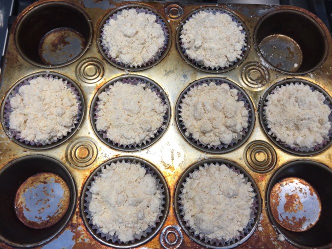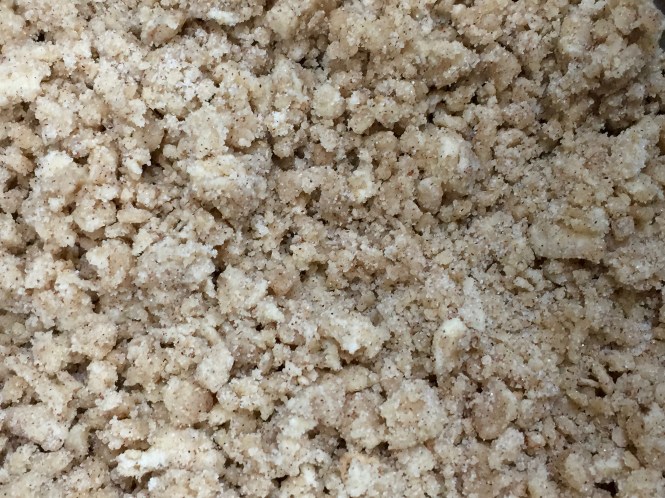 For the streusel topping combine sugar, flour and chilled butter in a bowl. Cut the butter in with a pastry blender until the mixture is crumbly and and the crumbles are pea sized. Set aside.